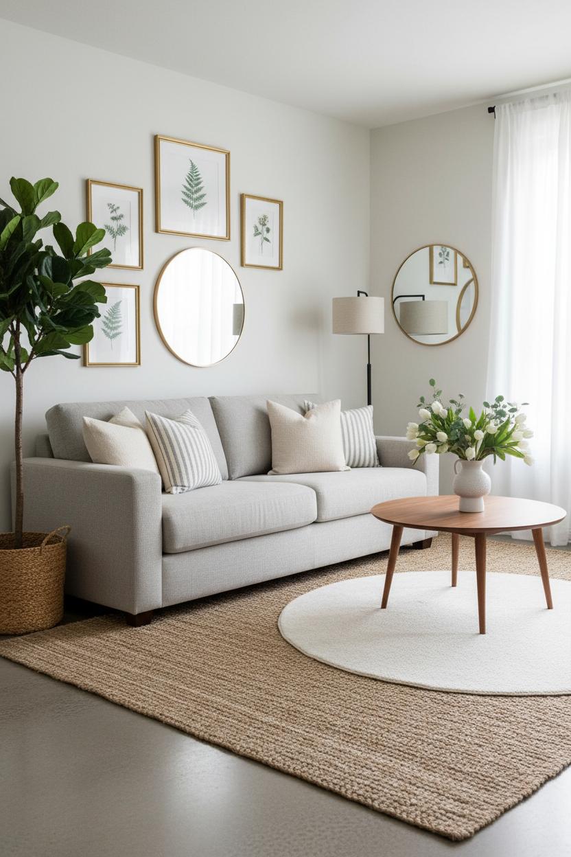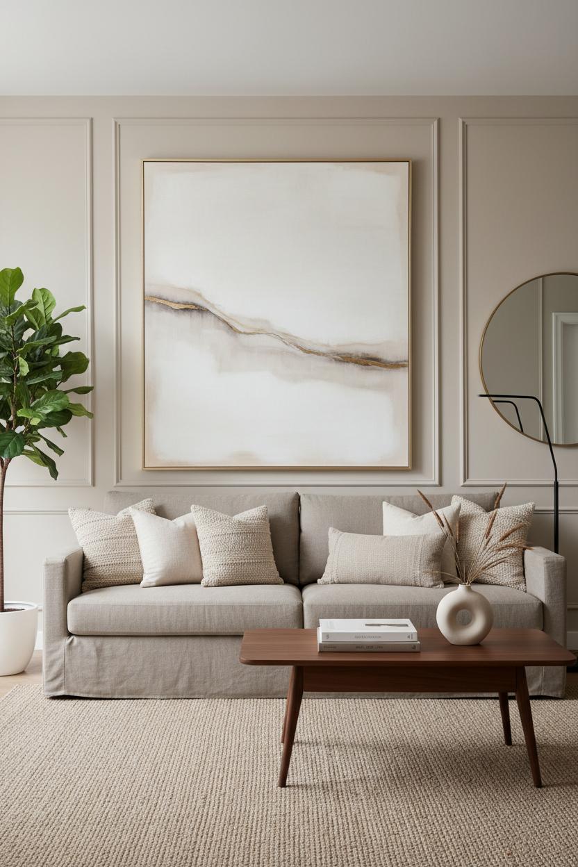 If you want your walls to quietly work the room for you, think scale, shine, and soft color. In a modern living room, a single oversized canvas (or a simple diptych) with generous negative space instantly stretches the sightline and calms visual clutter—perfect for a cozy living room that still feels airy. A tight, curated gallery with matching frames and creamy mats can do the same, especially when it hugs the width of your sofa and climbs toward the ceiling. Keep the palette in the family of warm whites, taupe, and mushroom so it blends with neutral home decor, then sneak in a hint of brass or black frame edges for contrast. Mirrors are your secret expansion pack: float a large round or arched mirror opposite a window to bounce daylight across the room, or lean a tall mirror behind a faux fiddle leaf fig so the greenery doubles and the corner looks deeper. At night, let an LED floor lamp graze that mirror for a soft glow that reads like another window. Anchor the scene with a mid-century coffee table and a textured area rug, then finish the sofa with neutral throw pillows for tactile balance.