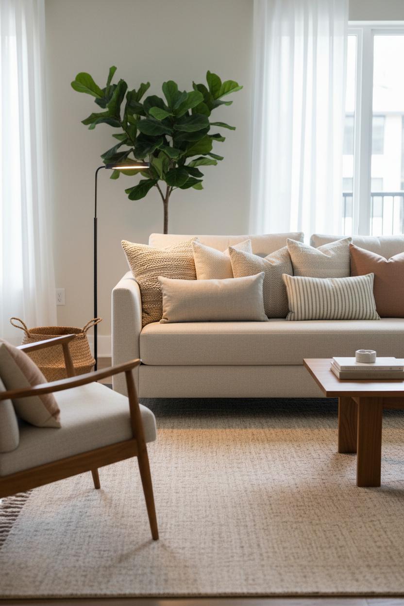 Round things out with pieces that echo the textures you’ve introduced. A mid-century coffee table in warm wood adds a clean, sculptural line against the softness of the rug and pillows, while an LED floor lamp casts a cozy, dimmable glow that flatters evening lounging. Tuck a faux fiddle leaf fig in a woven basket for life and height without the maintenance, and you’re done: a layered, lounge-ready retreat that balances sleek and snug. This is the sweet spot of a truly modern living room—thoughtful neutrals, tactile materials, and an easy rhythm that makes every corner feel considered and comfortable.