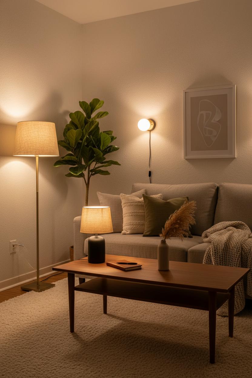 If you’re working with a petite footprint, consider these small living room ideas for a big-impact glow-up. Mount or clip plug-in sconces higher to draw the eye upward and make the ceilings feel taller, then tuck a slender LED floor lamp into a corner so it uplights the wall without hogging square footage. Keep your palette calm with neutral home decor—think neutral throw pillows, a nubby throw, and a simple vase—so the light becomes the star and everything else feels layered, not busy. A faux fiddle leaf fig in the corner catches that rim of light beautifully and adds sculptural height without the maintenance. Mix finishes thoughtfully: matte black or aged brass on sconces, a warm drum shade on the floor lamp, maybe a frosted globe for diffusion. The magic is in the balance—ambient from the floor lamp, accent from the sconces, and just a whisper of task light from a tabletop lamp when you’re journaling at the coffee table. With a few well-placed pieces and the right glow, your modern living room will look curated in daylight and completely irresistible after dark.