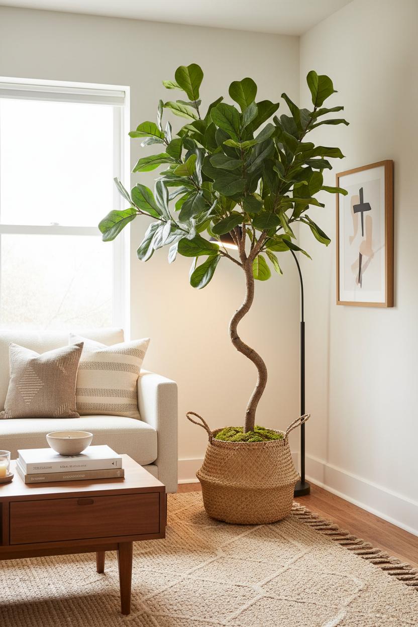 Nothing cozies up a modern living room faster than a burst of lifelike green, and a faux fiddle leaf fig brings that organic texture without the guesswork. Look for a tree with varied leaf sizes and a trunk that isn’t too perfect—those sculptural bends feel believable and add movement to your living room decor. For scale, a 5–7 foot tree makes a statement in an airy corner, while a 3–4 foot version is perfect for small living room ideas where every inch counts. Slip the plain nursery pot into a woven basket or a matte ceramic planter, then top with preserved moss for a finished, high-end look. Gently bend the branches so they arc and swoop like the real thing, fluff the leaves to create negative space, and rotate a few to catch the light. During the day, nestle it near a window for that sun-kissed sheen; at night, backlight the glossy leaves with an LED floor lamp for a soft, cozy living room glow that doubles as ambiance.