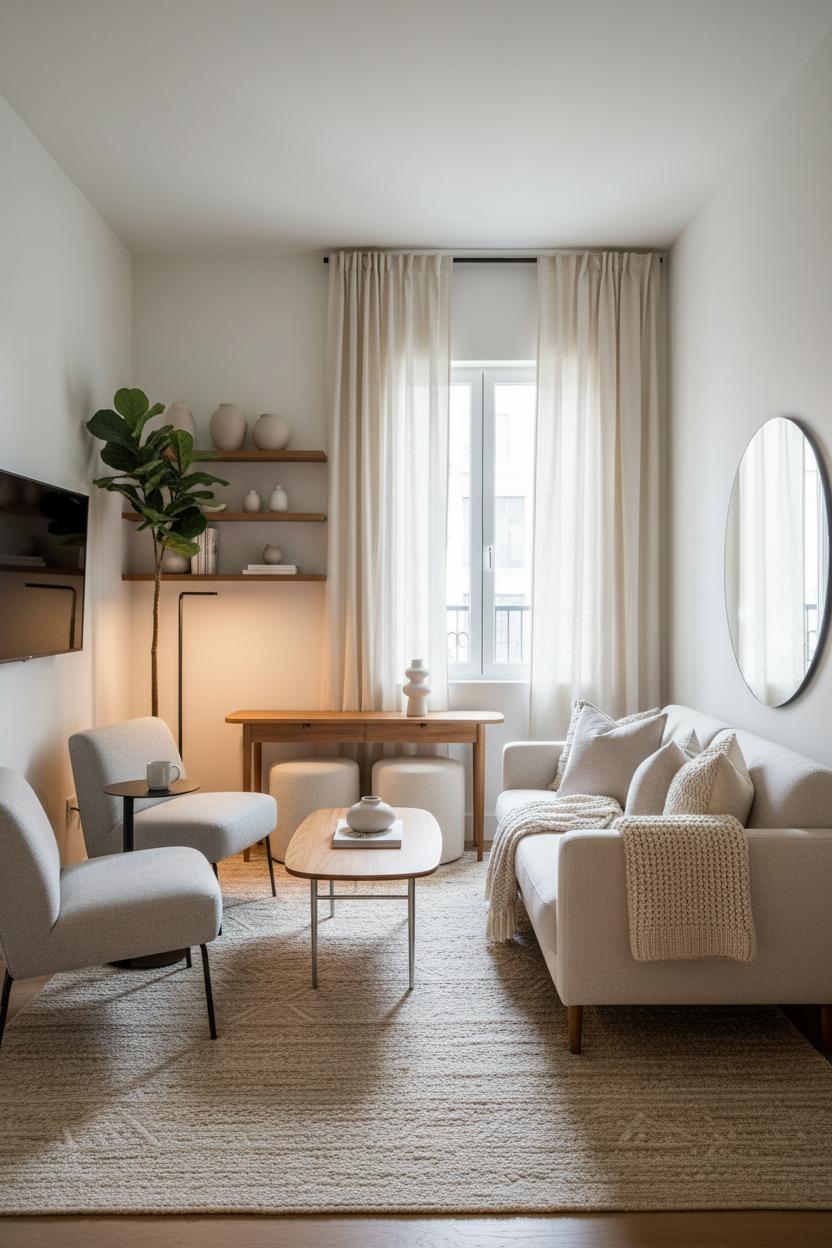 When space is tight, layout becomes your secret styling superpower. Start by floating your main seating a few inches off the wall to create breathing room around the edges; a compact sofa paired with two armless chairs keeps sightlines open and conversation cozy without crowding the floor. Opt for pieces with slim, raised legs so light travels underneath, and choose a mid-century coffee table with rounded corners to smooth traffic flow. Tuck a pair of small ottomans under a console for instant pull-up seating when friends drop by, then slide them back to keep the room feeling airy. If you’re working around a TV or fireplace, angle chairs slightly inward so everyone has a clear view, and keep the tallest items—like a bookcase or media cabinet—on a single wall so your eyes can sweep the room uninterrupted.
