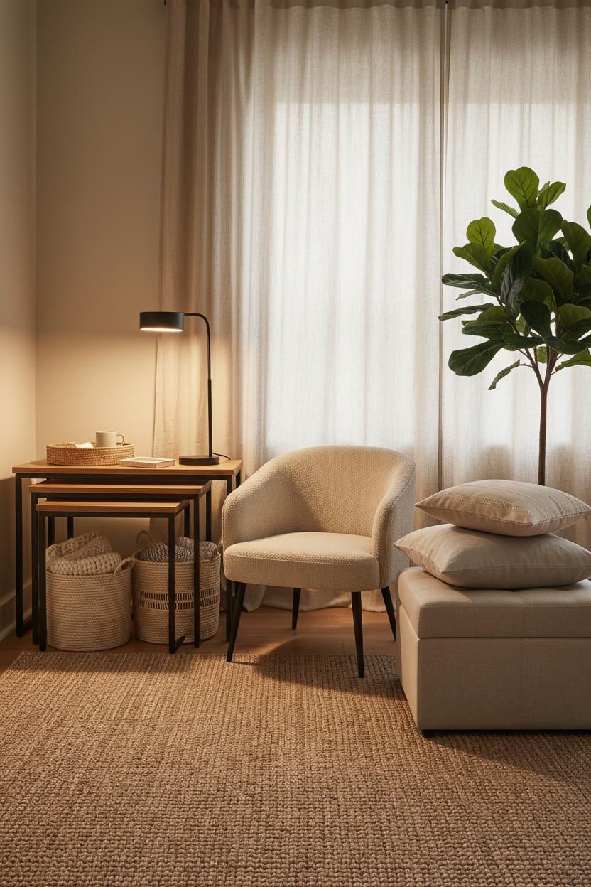 If you’re working with a compact footprint and hunting for small living room ideas, texture can actually make the room feel larger by creating depth without visual clutter. Keep your palette grounded in neutral home decor—think sand, oatmeal, and stone—then play with scale: a petite boucle accent chair, a slim wood console, and nesting side tables that tuck away. Hang linen drapes high and wide to draw the eye up, and choose a textured area rug that extends beyond your seating to frame the zone. Balance those woven moments with sleek elements so the look stays tailored: a mid-century coffee table paired with a matte-black LED floor lamp feels polished next to baskets and seagrass. Even a single statement piece, like a linen-wrapped ottoman with hidden storage, can multitask and streamline your living room decor. Keep greenery simple with a faux fiddle leaf fig for height and life, then finish with a trio of neutral throw pillows to invite those curl-up moments. The result is a layered, livable, and unmistakably cozy living room that reads timeless yet totally now.