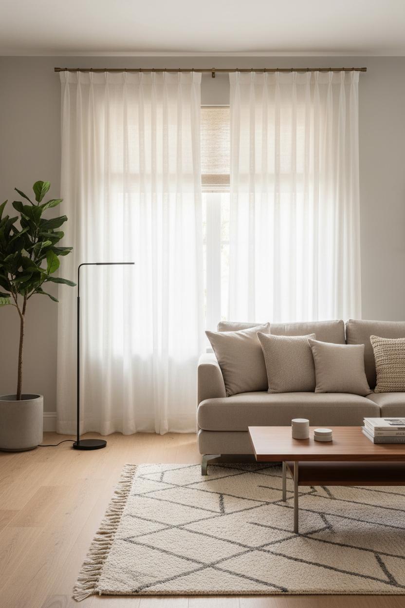 Let your window textures set the tone for the rest of your living room decor. Echo the drapery palette with neutral throw pillows and balance the softness with a textured area rug underfoot to ground the space. Keep sight lines open with a low-profile mid-century coffee table so those breezy panels take center stage. A slender LED floor lamp tucked beside the curtain stack adds evening ambiance without stealing window real estate, and a faux fiddle leaf fig in a simple planter brings height and life where a bulky cabinet might block light. Keep hems just kissing the floor for a relaxed, tailored look—no heavy puddles needed in a neutral home decor scheme. The result is a quietly layered, light-washed room that feels curated yet effortless: soft movement at the windows, cozy glow at night, and an airy foundation you can refresh seasonally with new textiles and greenery.