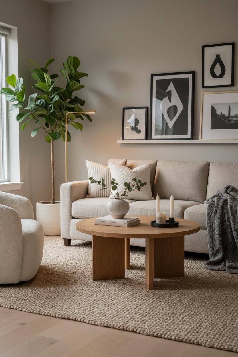 Warm minimalism is all about that sweet spot where clean lines meet lived-in comfort—the kind of modern living room that looks pulled together but invites you to curl up with a cup of tea. Start with a soft, pared-back palette that nods to nature: think warm white walls, oatmeal upholstery, and hints of clay and caramel. In terms of living room decor, let each piece breathe. A low-slung linen sofa instantly sets a relaxed tone, while a boucle accent chair adds that irresistible, touchable texture. Ground the seating with a chunky jute area rug for earthy warmth and subtle pattern underfoot. Then bring in an oak coffee table with rounded edges or an organic silhouette to soften the geometry and introduce wood grain that feels timeless. The key is restraint with intention—fewer pieces, better materials, and layers of texture so the space feels edited yet welcoming.