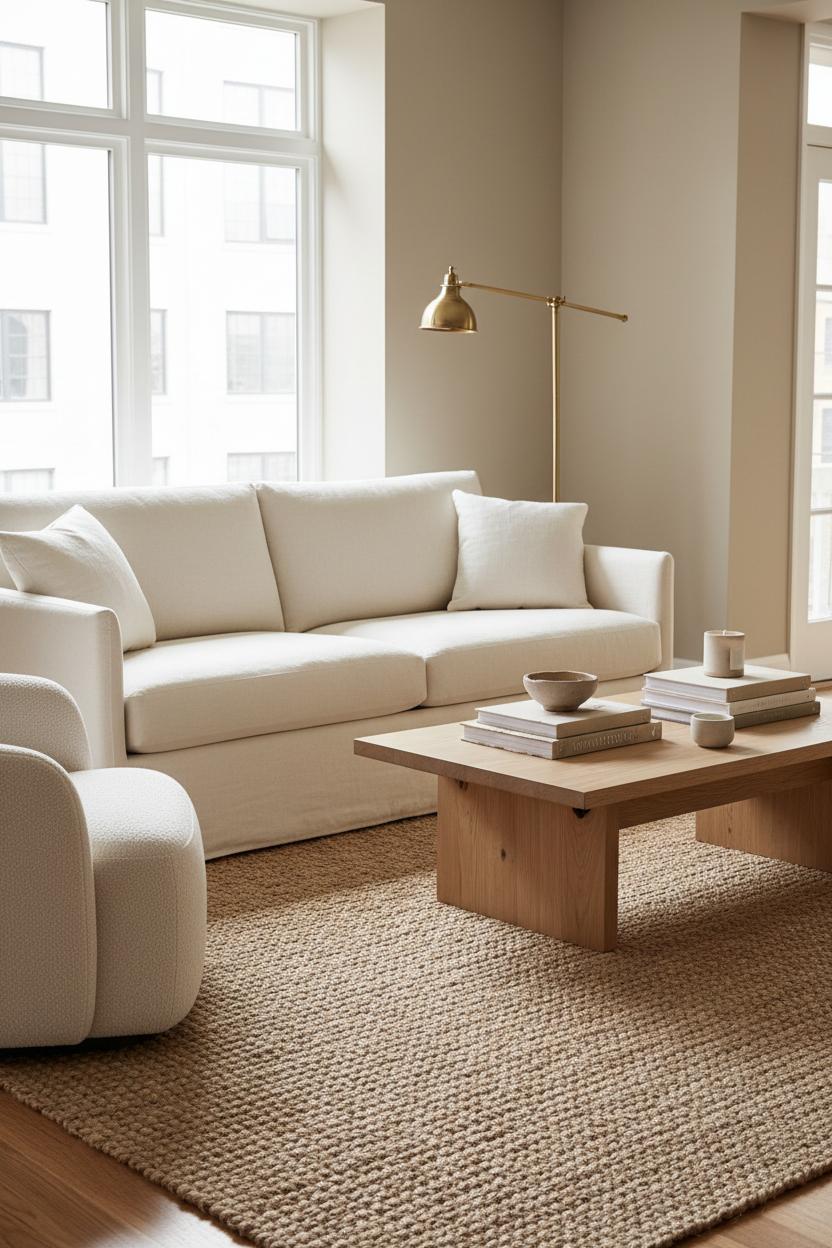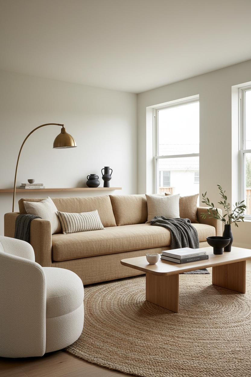 Furnishings are your quiet storytellers. An oatmeal linen sofa sets a relaxed foundation, and a cloud-like boucle accent chair brings that irresistible sink-in moment. Underfoot, a chunky jute area rug warms up the floor and introduces an earthy weave that instantly feels welcoming. Balance those tactile notes with an oak coffee table—rounded edges and honeyed grain keep the vibe soft and organic—then sprinkle in clean-lined pieces to maintain the modern thread. For glow, a brass floor lamp adds a gentle, golden shimmer at dusk, making the whole seating area look like it’s exhaling. Keep patterns subtle and tonal: a fine stripe on pillows, a faint herringbone in a throw, or a softly speckled ceramic vase on the table.