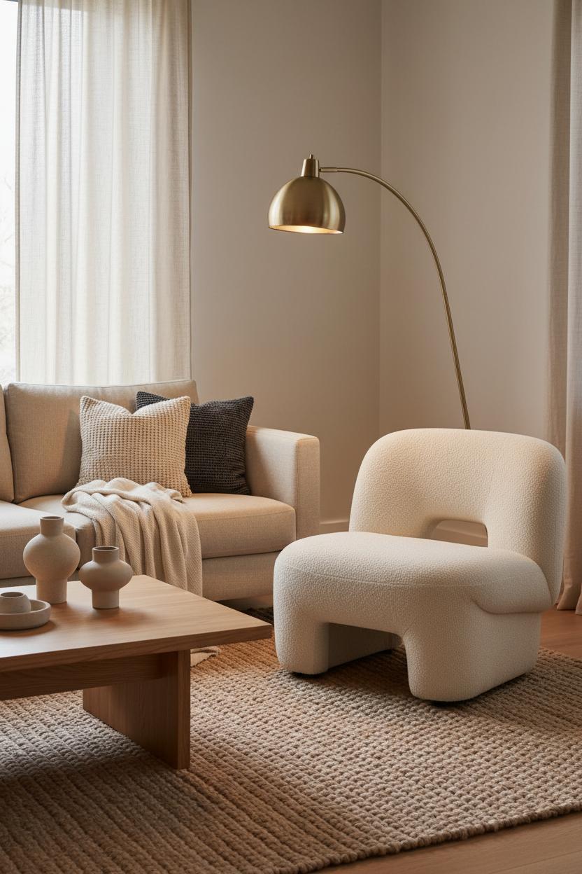 Lighting seals the mood. A brass floor lamp arcing over the chair pools a gentle glow across those boucle loops, creating a reading nook that feels like a hug. Balance the softness with an oak coffee table to add natural grain and a touch of earthy structure, then echo the tones with a few ceramic accents and a slubby throw. Angle the chair slightly toward the sofa so conversation flows, and don’t be afraid to mix finishes—brass, oak, linen, and jute are the dream team of approachable elegance. For easy interior design ideas that look pulled together fast, start with the big four: a timeless linen sofa, that irresistible boucle accent chair, a hardworking jute area rug, and an oak coffee table. Layer in a couple of textured pillows and a cozy throw, and you have a modern living room that feels considered but effortless. The result is a cozy living room that reads calm and curated, proof that when it comes to living room decor, texture truly does the talking.