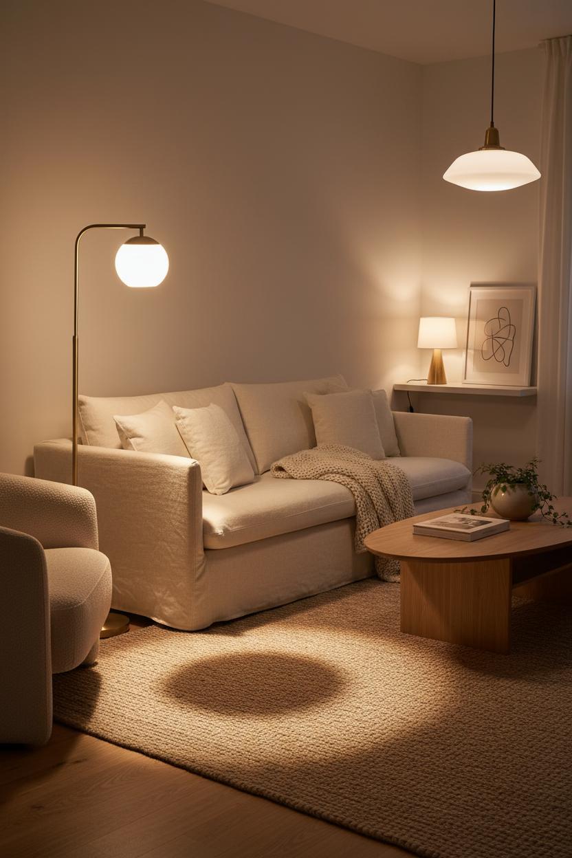 For the best glow, choose a warm 2700K bulb (a frosted globe is lovely) and add a dimmer or smart plug so you can adjust from movie-night low to pages-open bright. Build a triangle of light: overhead for ambient, the brass floor lamp for task and mood, and a small table lamp to highlight art or greenery. This creates depth, flatters textures, and lets every material sing—the nubby weave of the jute, the smooth grain of the oak, the relaxed drape on your linen cushions. Keep cords tidy (tuck them under the rug or guide them along a table leg), and let the lamp’s arc or slim silhouette echo the clean lines of your modern pieces. These simple interior design ideas make a cozy living room feel collected rather than cluttered, especially when you repeat finishes sparingly and let that soft brass hint at warmth throughout the space. The result is a living room decor moment that looks as good during a coffee catch-up as it does during a quiet night in—proof that one thoughtfully placed lamp can shift the whole mood, and make your neutral home glow from the inside out.