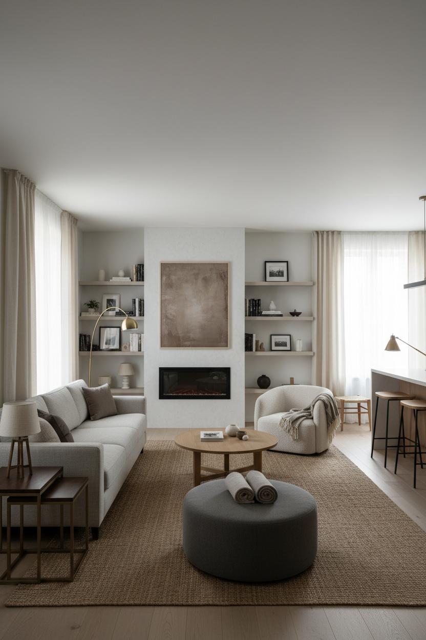 For small spaces or open plans, let furniture do double duty. Nesting side tables slide in and out for movie-night snacks, and a storage ottoman corrals throws while subbing in as extra seating. Wall-mount shelves to lift visual weight, and hang curtains high and wide to stretch the room. Keep sightlines low around windows and doorways, and tuck a reading nook into a bright corner with that boucle accent chair and a focused brass floor lamp. These interior design ideas are all about balance—soft textures with clean lines, cozy layers with breathing room—so your cozy living room feels lived-in yet polished. Edit often, style with intention, and let the layout flex as seasons (and gatherings) change.