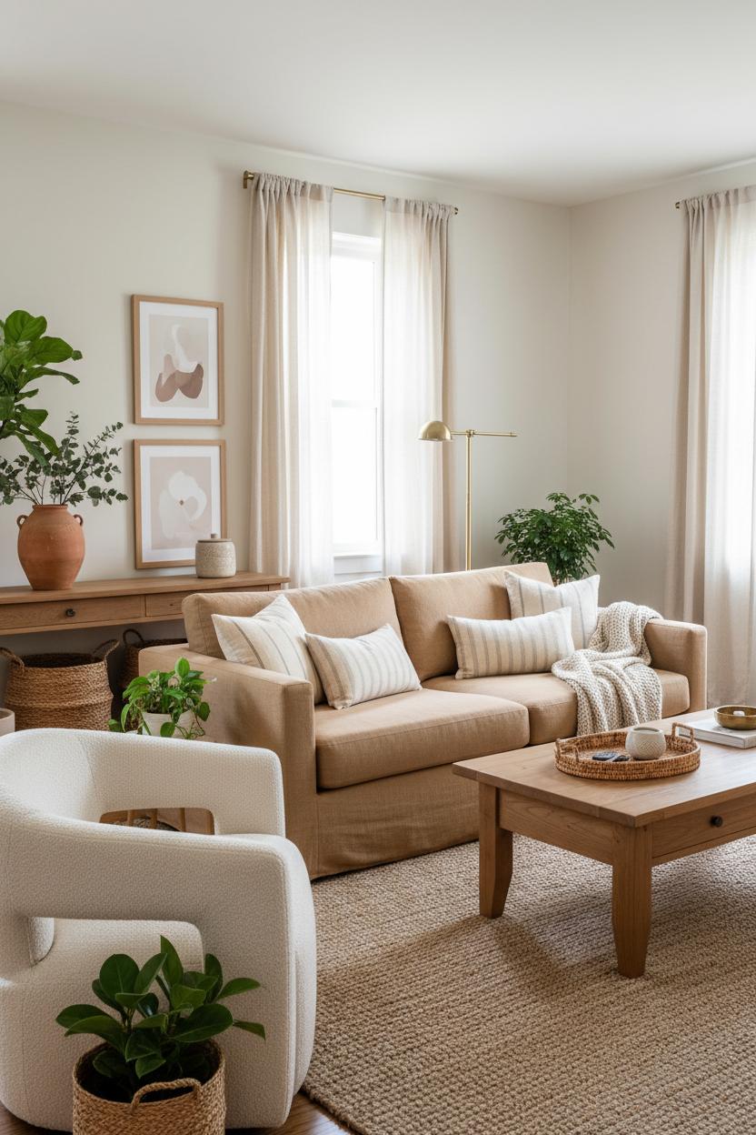 From there, it’s all about thoughtful details. Swap out bulky, expensive accents for wallet-friendly textures: cotton-linen pillow covers in tonal stripes or micro checks, a chunky knit throw tossed over the arm, and a ceramic or terracotta vase for branches or eucalyptus stems. Frame a couple of downloadable art prints to lean on your shelf (instant charm, tiny price), and tuck woven baskets under the console for a tidy, layered look. Add a rattan tray to corral remotes and candles on the coffee table, and echo the lamp’s glow with a small brass bowl or photo frame so the metal finishes feel intentional. Keep window treatments light—linen-look curtains hung high make the ceilings read taller—and let greenery do the styling heavy lifting. The result is a collected, breathable space that feels elevated yet unfussy: the sweet spot of modern living room polish and Sunday-afternoon ease. Consider this your save-and-shop checklist of interior design ideas—simple swaps and texture-rich finds that turn a neutral home into something warm, welcoming, and wonderfully you.