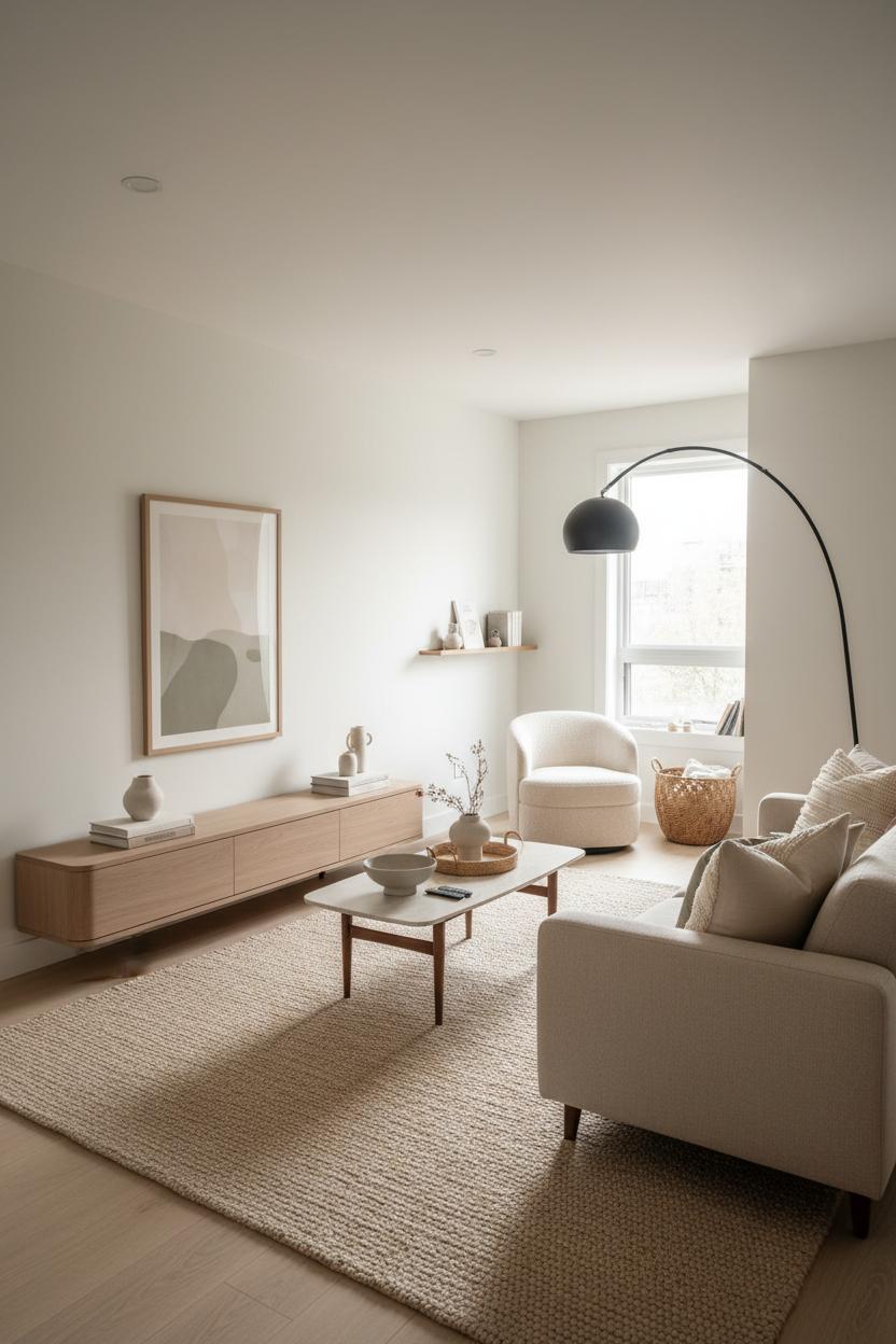 When you’re working with a small space layout, the magic is in subtle zoning that keeps your modern living room feeling open, airy, and intentional. Start by grounding the conversation area with a textured area rug in a warm oatmeal tone; it’s an instant anchor for your neutral decor and sets the boundary for where furniture lives without crowding the room. Instead of pushing everything against the walls, float a streamlined beige sofa a few inches off, then slide in a mid-century coffee table with slim legs to keep the footprint visually light. A sculptural arc floor lamp arcs over the setup to create an intimate pool of light, so you can skip extra side tables and still have that cozy home glow. Layer in linen throw pillows in varying tones of cream and greige for depth that whispers, not shouts.