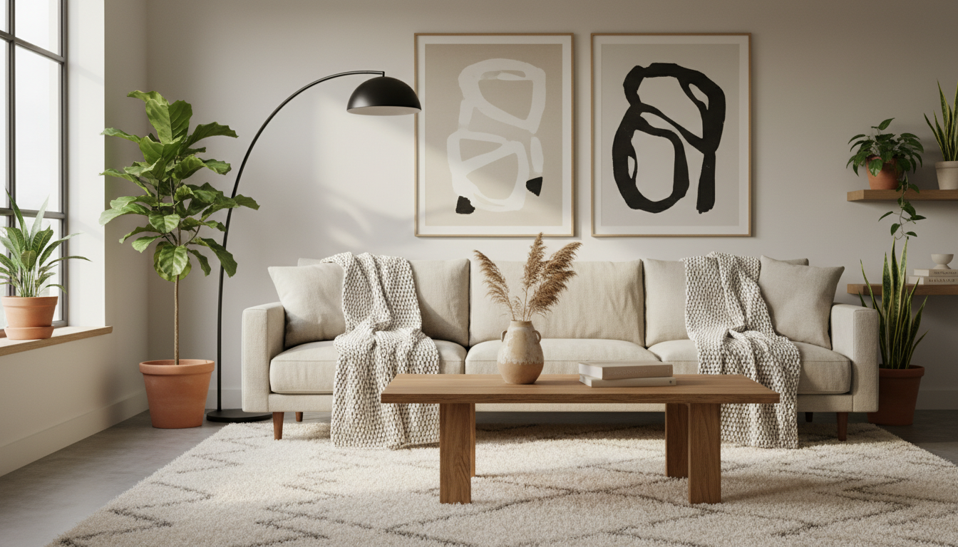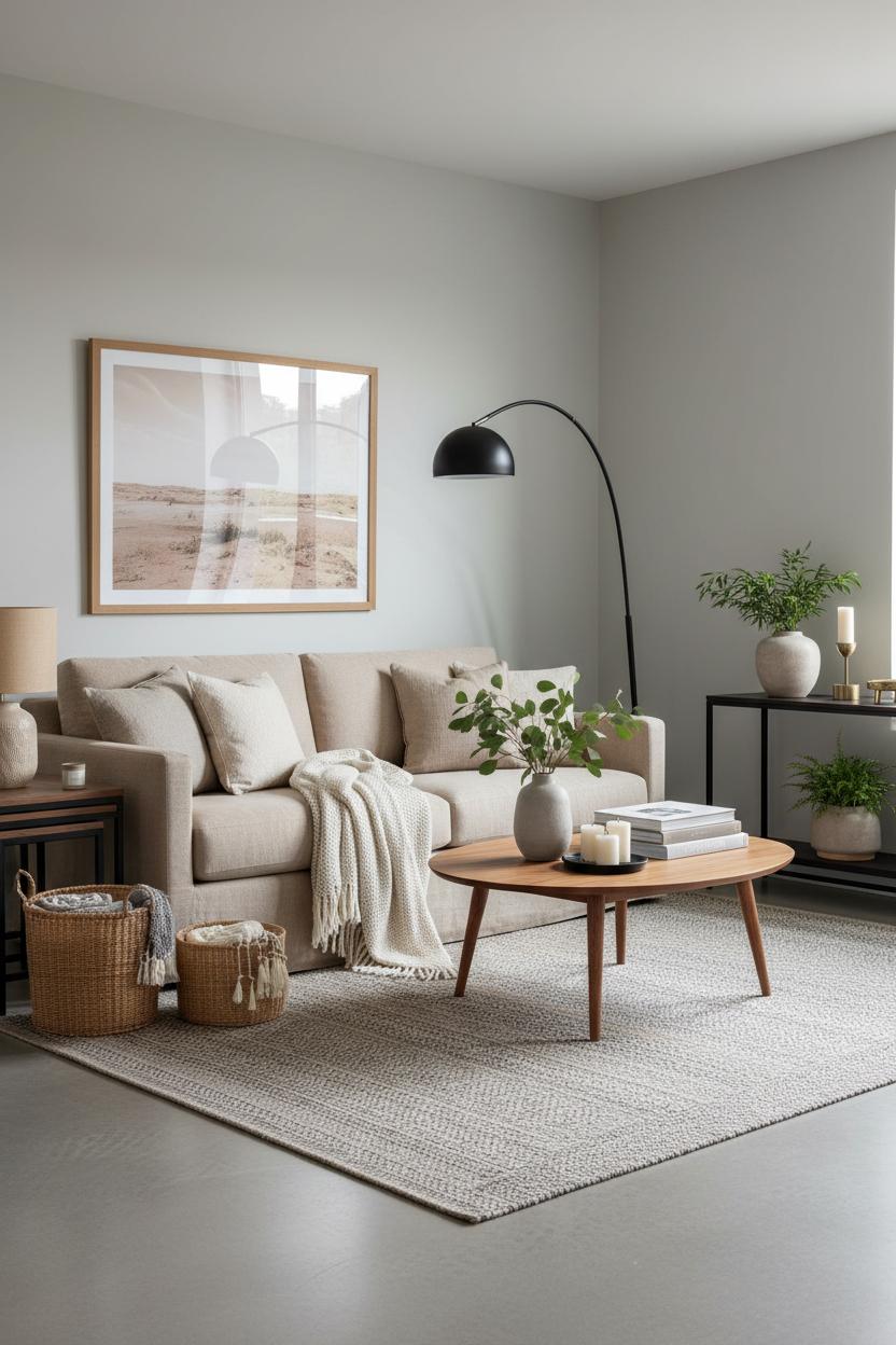 To add depth, play with texture and finishes rather than strong color. A textured area rug warms up the floor and visually softens straight architectural lines, while a mid-century coffee table in oak or walnut adds a sculptural moment without shouting. Brass or matte black accents—like the slim arc floor lamp—deliver just enough contrast to keep things interesting in a modern living room. Consider woven baskets, boucle or brushed cotton throws, and stoneware vases for tactile variety. If you crave a tiny twist, mix in a muted stripe or micro-check on a pillow, or bring in one deeper note like espresso wood or charcoal pottery to give your eye a place to rest.