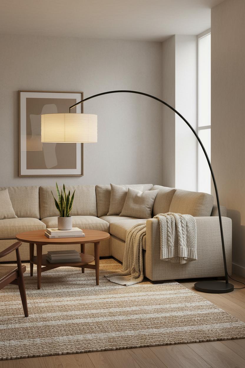 When you’re working with a small space layout, an arc floor lamp is the secret weapon that brings drama without eating up precious square footage. Think of it as sculpture-meets-function: tuck the sturdy base just behind the corner of a beige sofa or alongside a compact accent chair, and let the arm sweep over your mid-century coffee table to cast a soft pool of light right where you lounge. It frees up surface space you’d normally reserve for a table lamp and instantly creates a focal point that feels editorial yet effortless. For a modern living room with neutral decor, choose an arc in matte black or warm brass and a linen or paper shade that echoes your linen throw pillows—those repeated textures tie the look together while keeping the palette calm and cohesive. Bonus: a dimmer makes it easy to go from task lighting to that golden-hour glow that makes any space feel like a cozy home.