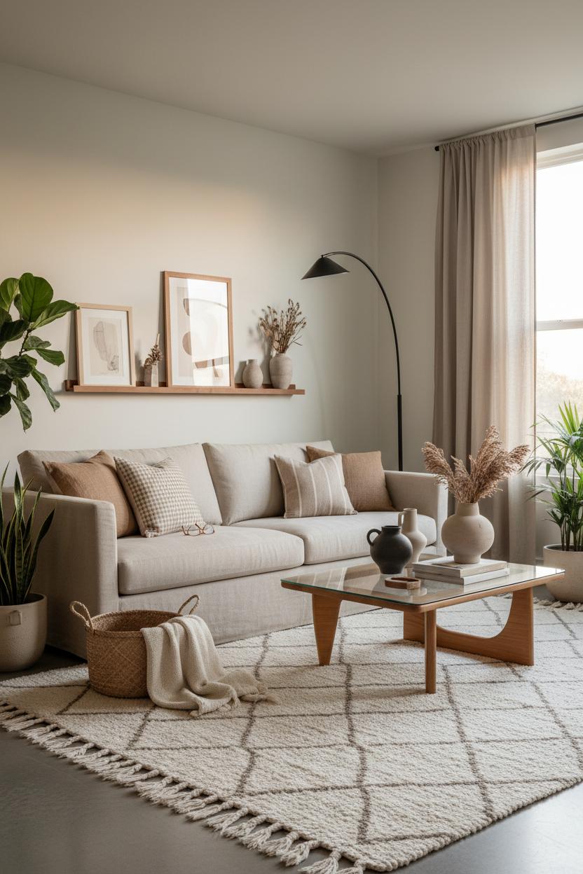 Think of neutrals as the quiet foundation that lets your modern living room breathe. Start with a soft, sun-washed palette—creamy whites, warm taupes, a hint of greige—and let texture do the talking. A streamlined beige sofa instantly sets a calm tone, especially when paired with a textured area rug that adds depth underfoot without stealing the show. With neutral decor, you’re not chasing color trends; you’re curating layers: woven baskets, matte ceramics, a touch of wood grain, maybe a stone tray with gentle veining. The result is that unmistakable cozy home mood—light-filled, grounded, and effortlessly pulled together—while still feeling fresh and current.