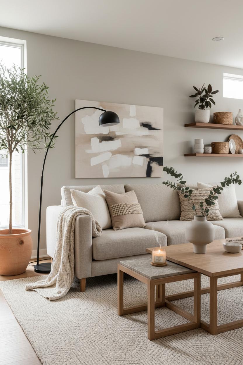 The beauty of a neutral-led modern living room is how easily it adapts. Swap in a nubby throw when the temperatures drop, or layer a light linen blanket in warmer months. Keep surfaces edited: one large vase with branches beats a cluster of small trinkets, and a single oversized art piece can balance the room better than a busy gallery wall. Add life with greenery—olive, rubber, or eucalyptus—and let natural light bounce off subtle textures instead of glossy finishes. Scent matters, too: a candle with cedar or linen notes completes the experience. With the right mix of simplicity and texture—your beige sofa, textured area rug, mid-century coffee table, arc floor lamp, and linen throw pillows—you’ll have a space that’s calm, curated, and endlessly inviting, no matter the size.