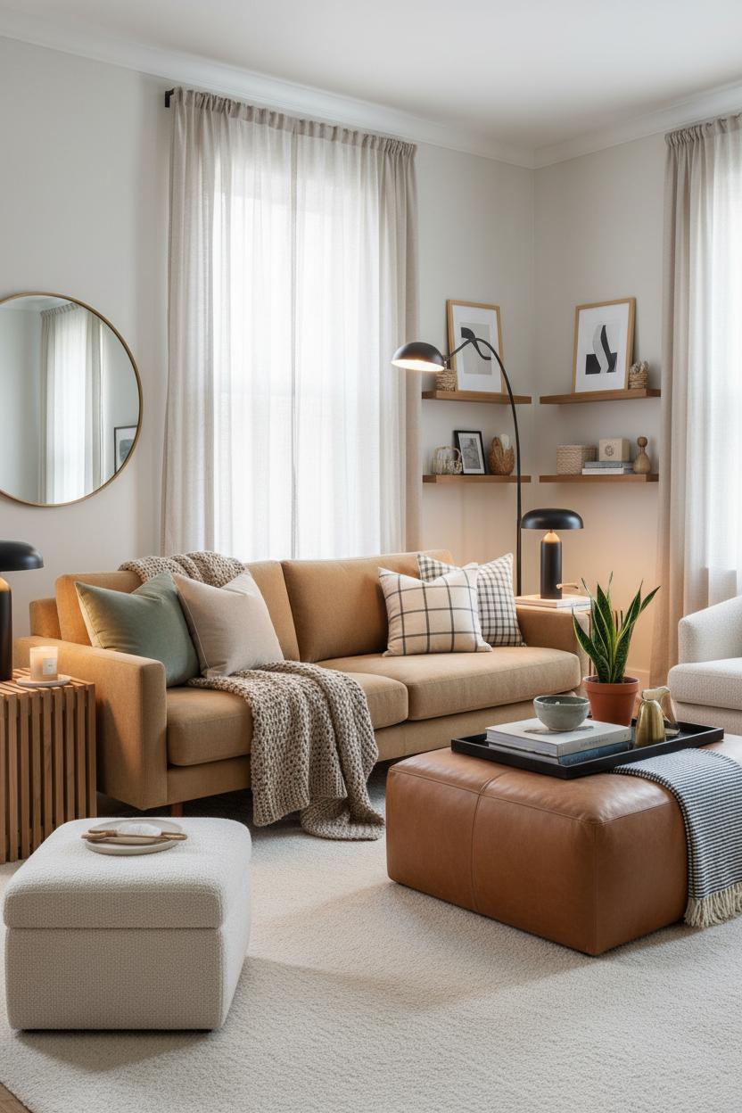 If you’re hunting for small living room ideas, think vertical and multifunctional. Floating shelves free up floor space while giving you a spot to layer framed art, woven baskets, and travel mementos without cluttering the room, and a storage bench or lidded ottoman tucks away throws in a snap. Keep patterns on a tight leash—pinstripes, tiny checks, and tone-on-tone weaves read cozy without shouting—and use mirrors to bounce light across the room so your modern living room feels larger. The result is an easygoing, tactile mix that invites you to curl up, kick back, and enjoy a living room makeover that looks beautifully styled yet completely livable.