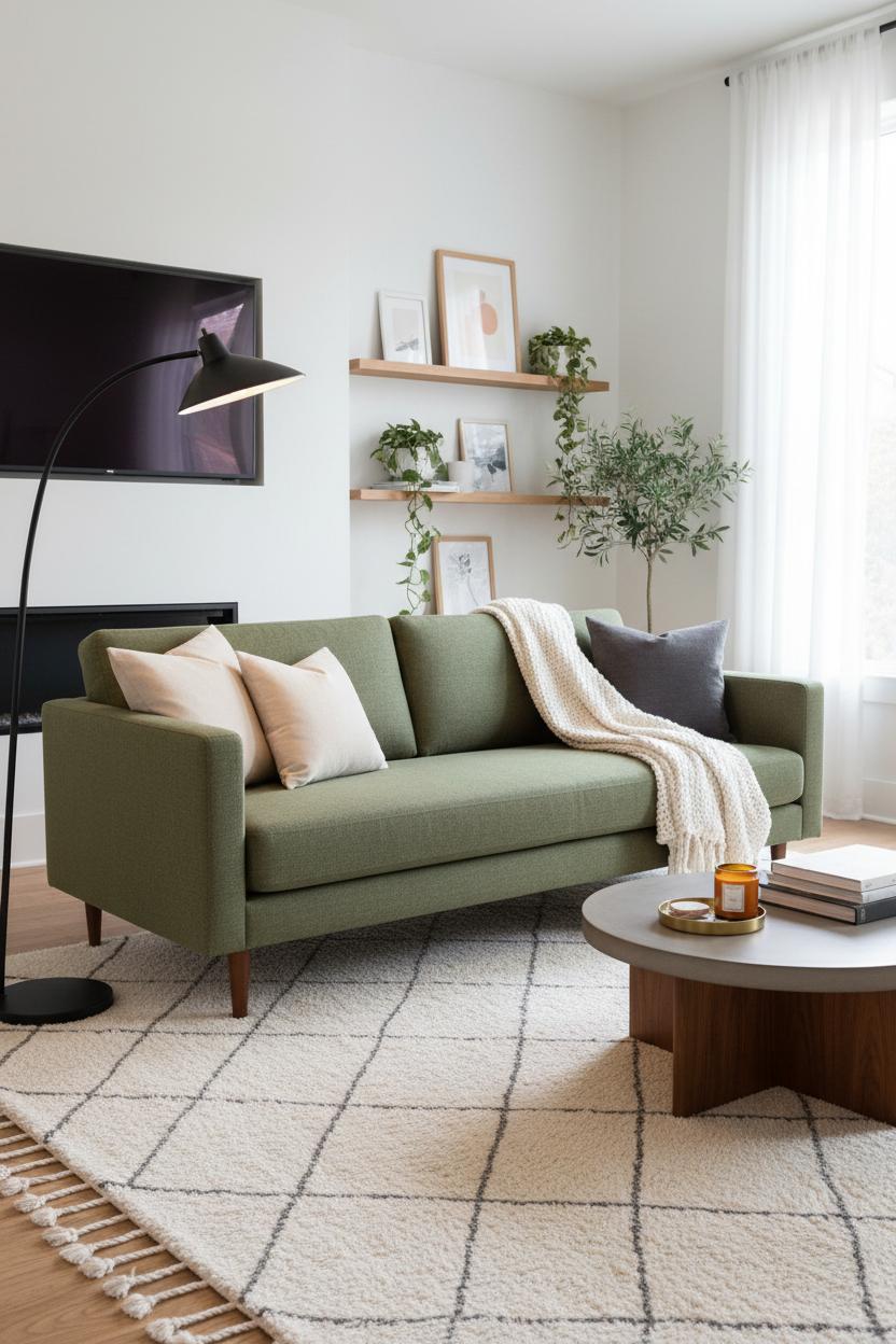 Once the big pieces are in place, the magic is in the layers. Ground your modern living room with a soft neutral area rug that makes everything feel pulled together and instantly cozier. Let a mid-century sofa anchor the scene, then pile on a tactile mix of pillows and a nubby throw so the whole space invites lounging. Create a moment on your coffee table decor with a low tray, a stack of art books, a sculptural candle, and a tiny vase of greens—simple and chic. If you’re working with a tight footprint, borrow from small living room ideas: keep your palette tight, lean into airy materials, and use vertical space. Floating shelves styled in gentle “thirds” (a few books, a framed print, a small ceramic) add personality without crowding; mirrors and an LED floor lamp bounce light into corners to extend the glow. Step back and edit so there’s breathing room between pieces—negative space is as much a part of your living room decor as the prettiest accessory.