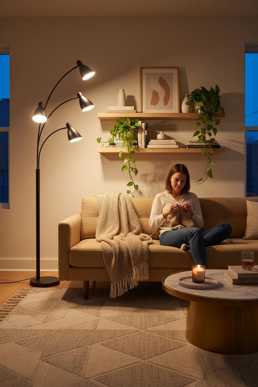 When the sun dips and the room starts to feel a little flat, that’s your cue to switch on a layered lighting plan and let an LED floor lamp do the heavy lifting. Think of lighting like jewelry for your living room decor: a base glow, a focused sparkle, and a soft shimmer. Start with ambient light by positioning a slim, dimmable LED floor lamp behind or beside your mid-century sofa so it bounces warm light off the wall or ceiling—instant softness without the glare. Then tilt an adjustable head for task lighting where you read or knit, and let a third beam skim across texture (a woven throw, art, or a plant) for a gentle accent. Aim for warm 2700–3000K bulbs to keep that cozy living room glow, and use 800–1100 lumens for reading while dialing it down for movie nights. In a modern living room, brass or matte black feels crisp; if you’re hunting small living room ideas, go for a slender arc or a tree-style lamp that layers light vertically without eating floor space. Hide cords along the baseboard or tuck them under a neutral area rug so the look stays streamlined, not cluttered.