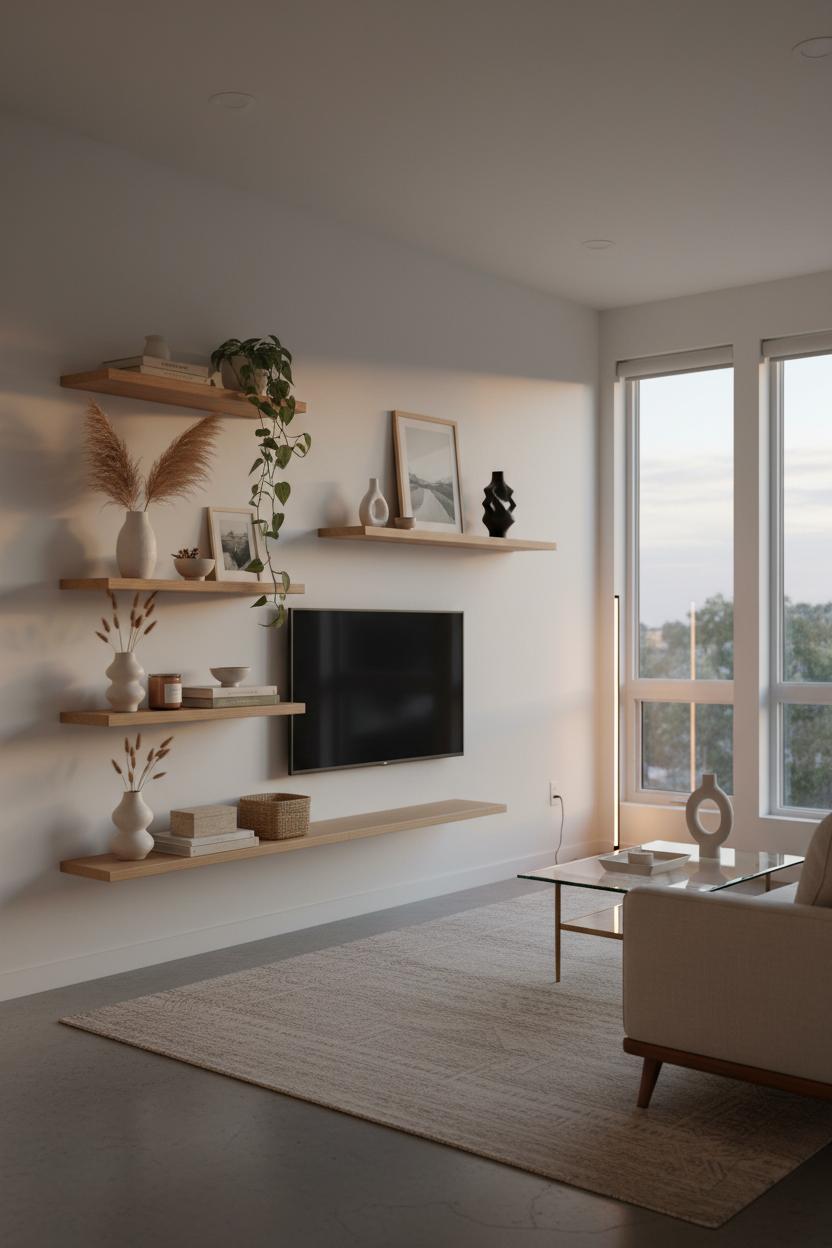 Think of floating shelves as the light, airy secret to making living room decor feel curated without crowding the room. Instead of a bulky bookcase, run two or three shelves in a staggered stack beside the TV or above a radiator, then repeat a single shelf over the arm of a mid-century sofa to balance the wall. In a modern living room, slim wood shelves with hidden brackets keep the look clean, while black metal adds a little edge. If you’re tight on space, try a vertical column of floating shelves in an awkward corner—one of my favorite small living room ideas for getting storage up and off the floor so the eye reads more open square footage. Keep sight lines gentle: align the bottom shelf around eye level, then float the rest 12–15 inches apart so the composition breathes.