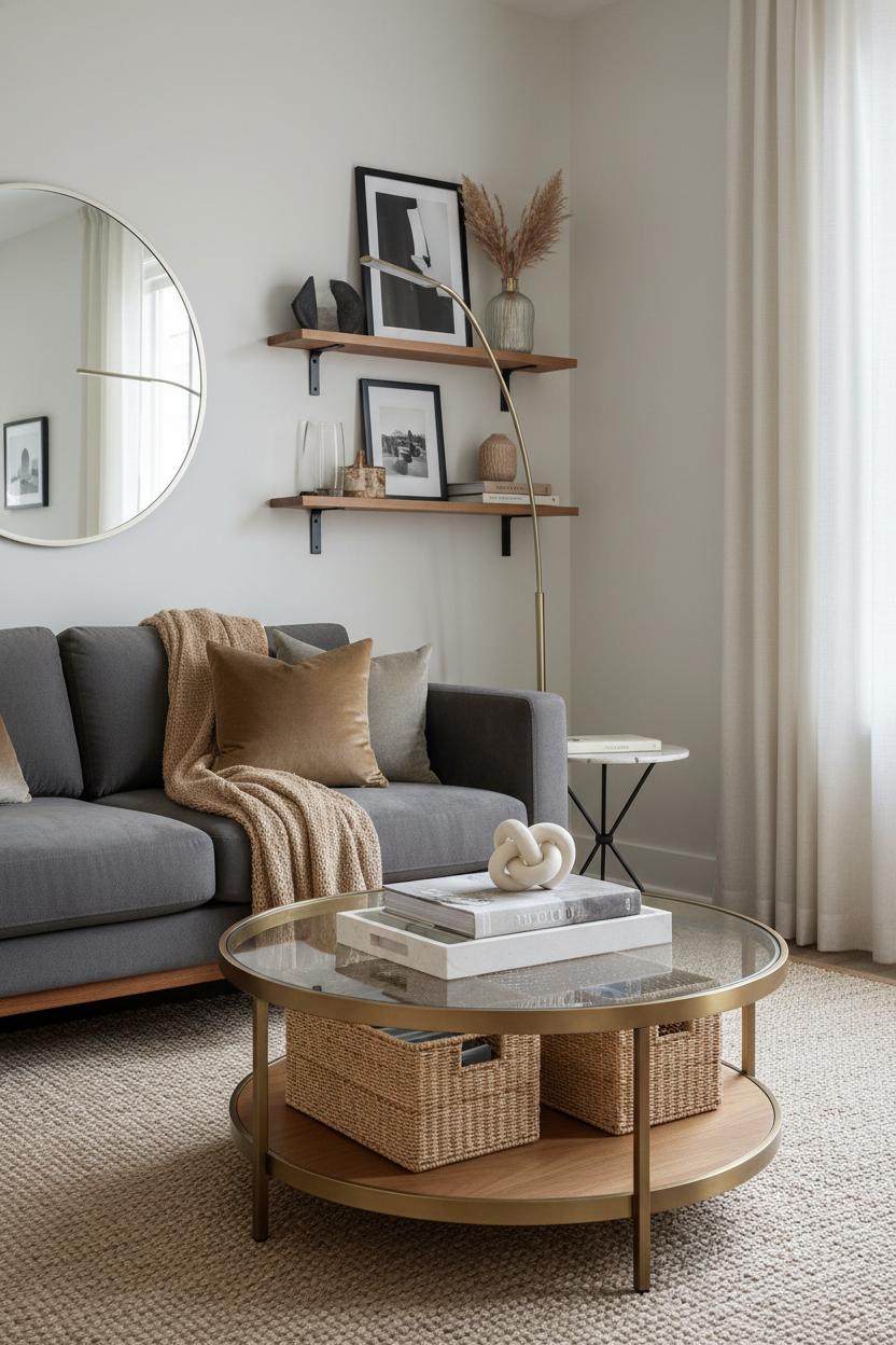 If you’re working with limited square footage, these small living room ideas keep everything airy and practical without skimping on style. Keep your palette soft and neutral, then introduce depth through materials—linen curtains, a velvet pillow or two, a ribbed glass vase, and black metal accents to punctuate. Swap bulky bookcases for floating shelves that display favorite reads and sculptures while freeing up floor space; echo the shelf brackets’ finish with a sleek lamp or picture frame so the room feels cohesive. Choose a round coffee table to soften corners and bounce light with a bit of metallic trim or a glass top, and tuck baskets underneath for stealthy storage. Repeat your mixed metals in petite doses—curtain rods, mirror frames, and hardware—so the eye travels and the room feels layered, not cluttered. With a few thoughtful swaps and a focus on tactile contrast, your living room makeover will look high-end yet approachable, proving that the right blend of materials and metals is the secret sauce to a fresh, lived-in modern living room.