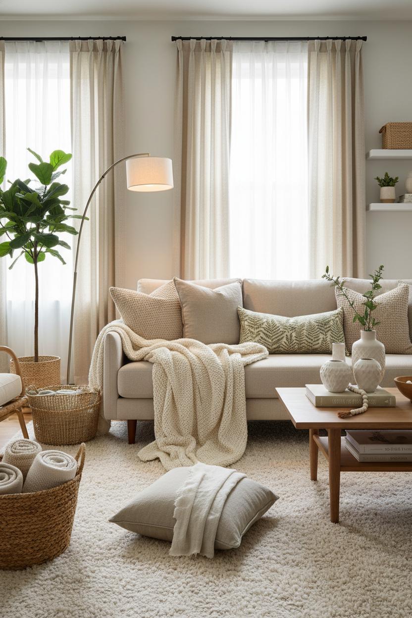 Curtains are your room’s wardrobe change—hang them high and wide to lift the ceiling line and make windows look generous, a favorite among small living room ideas. Sheers layered with blackout panels give you that airy daytime filter and cozy nighttime cocoon, and even a simple pinch pleat or ring clip adds just enough polish. Keep the palette cohesive by repeating tones from your pillows and throws—oatmeal, stone, and a hint of fern—then echo those hues in coffee table decor like ceramic vases, a stack of tactile books, and a low bowl for matchsticks or beads. Tuck woven baskets on floating shelves or beside the sofa to corral extra blankets, so the space still feels breezy between movie nights. A few thoughtful swaps—a softer rug, upgraded curtain lengths, richer pillow covers, and a dimmable lamp—can transform the mood in an afternoon, turning a straightforward living room makeover into that effortless, layered sanctuary you’ve been pinning.