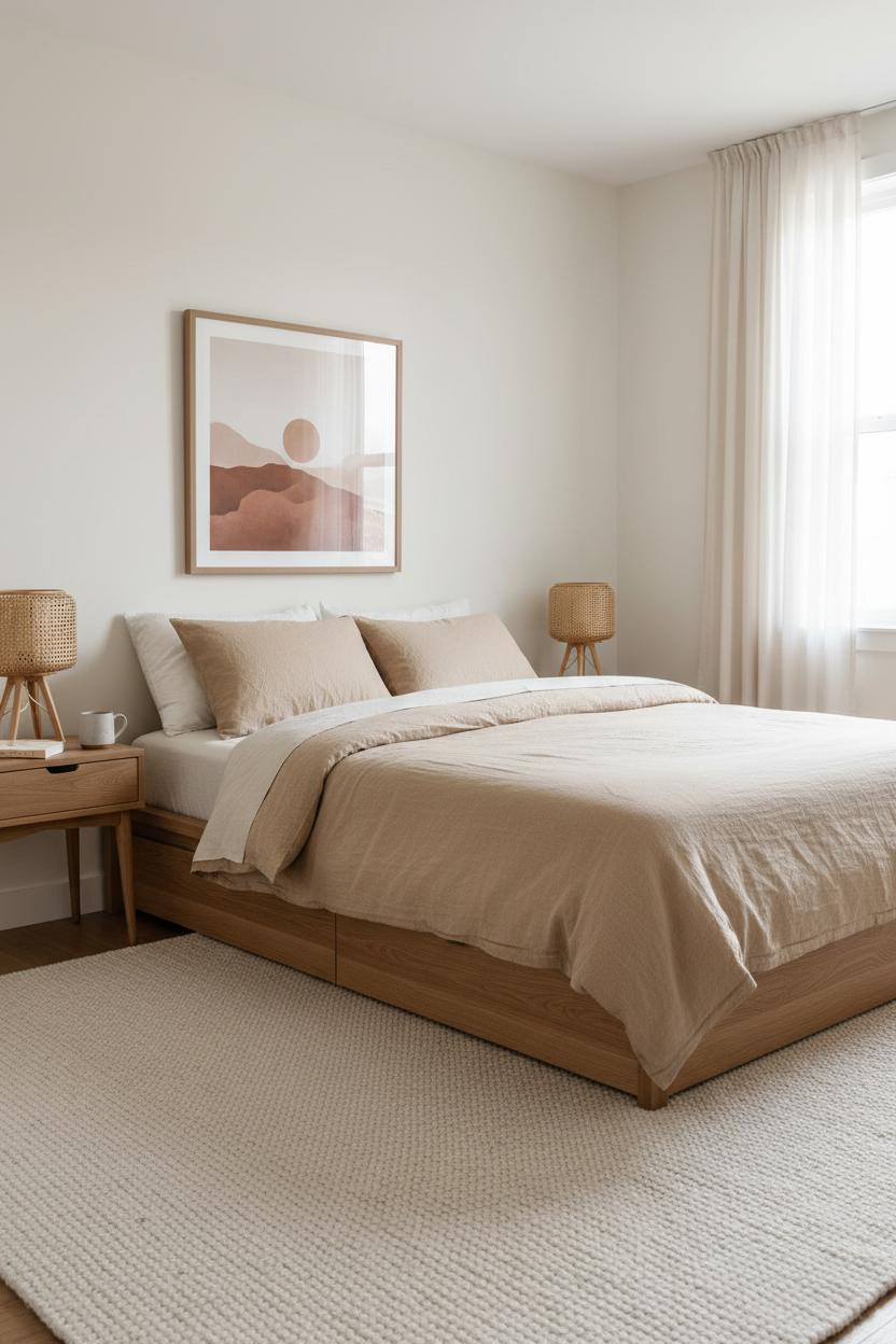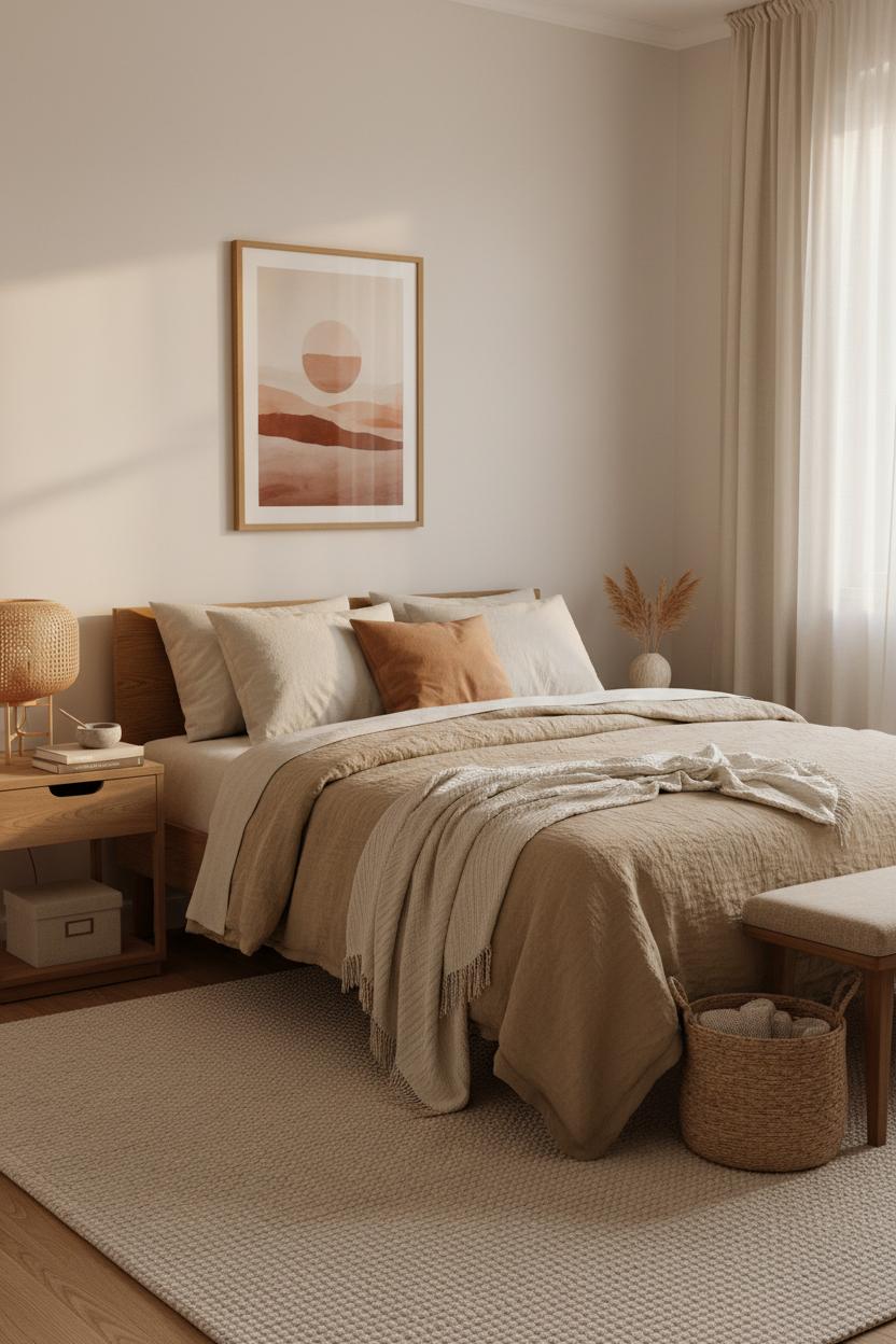 If you’re ready to recreate the look, you don’t need a huge budget or a massive space—these are small apartment ideas that work hard. On Amazon, look for a linen duvet cover in oat or ecru, a rattan table lamp with a rounded base, a neutral area rug in a warm ivory, an oak nightstand with clean lines, and framed abstract art that nods to a sunset palette—peach, rust, and soft taupe. Mix in a thrifted ceramic bowl, a woven basket for extra blankets, and sheer curtains that pool slightly for an airy feel. Keep the color story tight (think sand, stone, latte) and let wood tones and natural fibers do the talking. Hang the framed abstract art a few inches above the headboard to draw the eye up, tuck a slim bench or trunk at the foot of the bed for hidden storage, and corral cords in a linen box so everything reads calm. This is room inspo that proves cozy neutral decor can still feel elevated and fresh—edit, soften, and let the light do the rest.