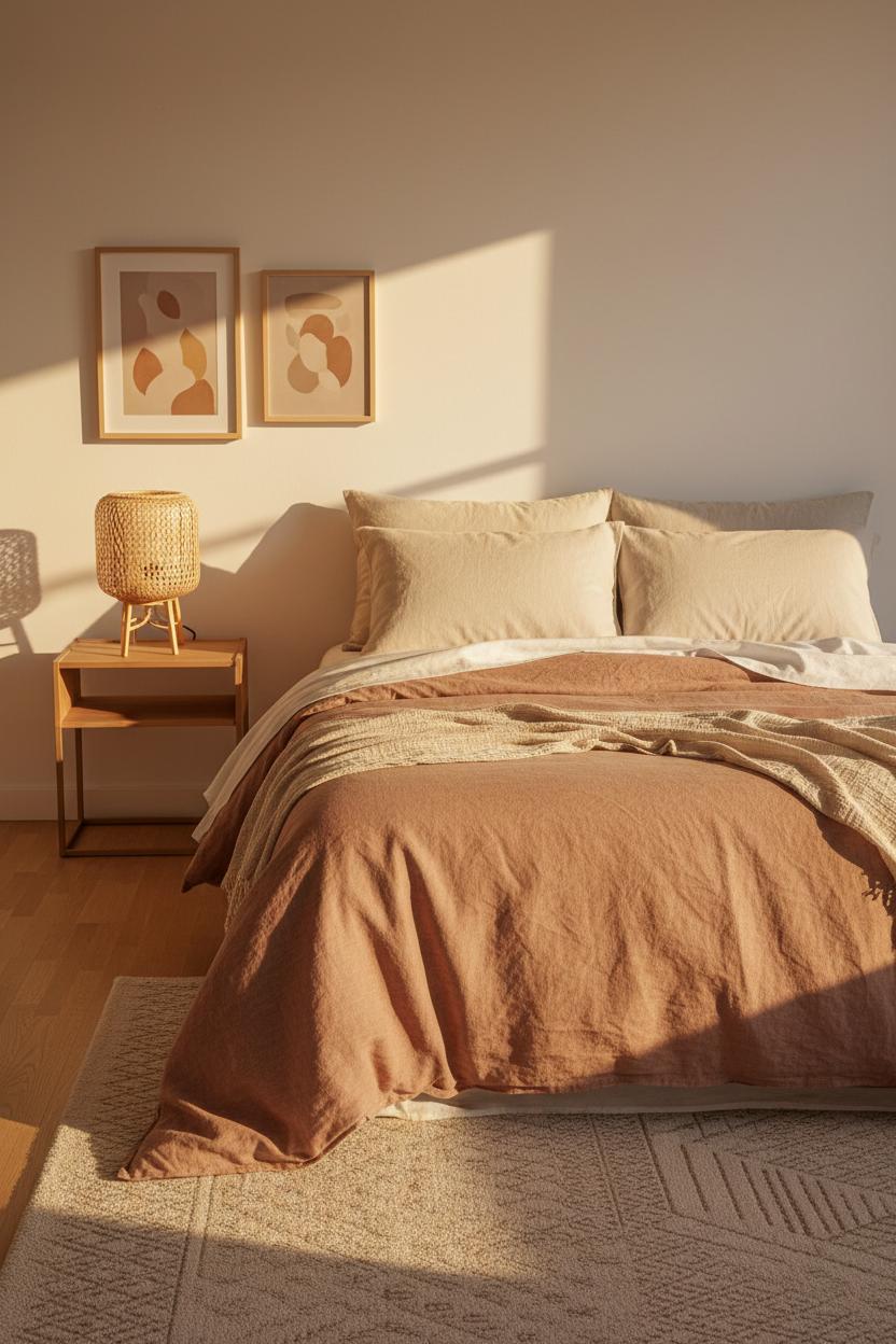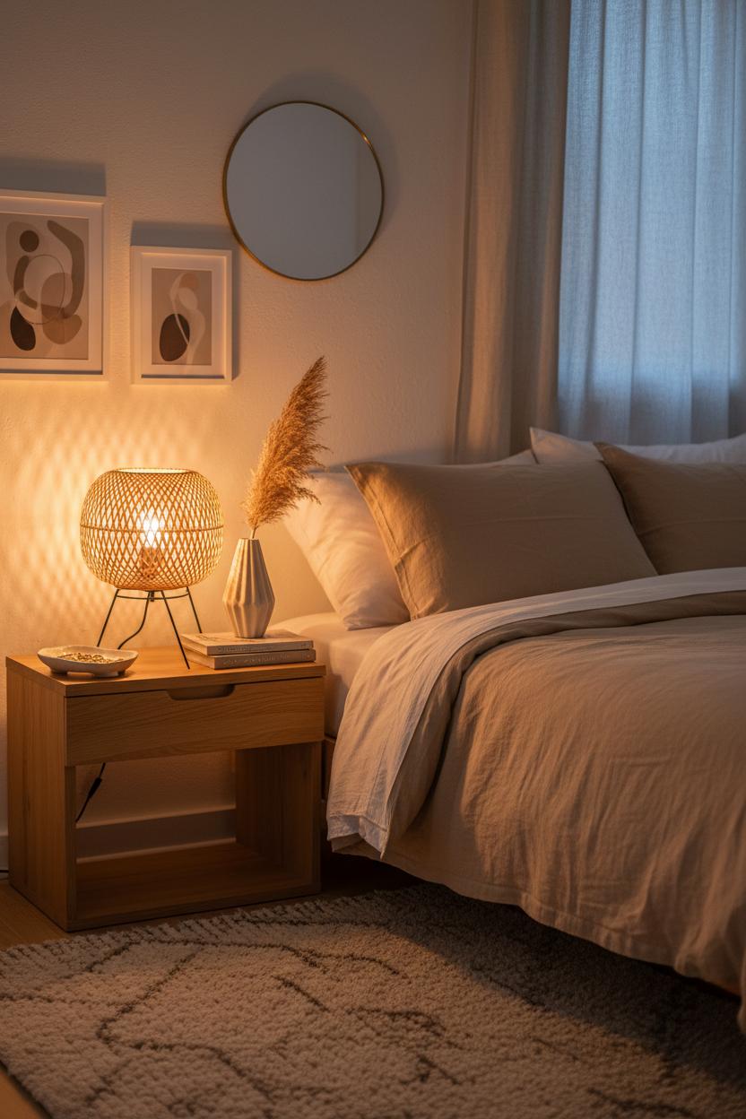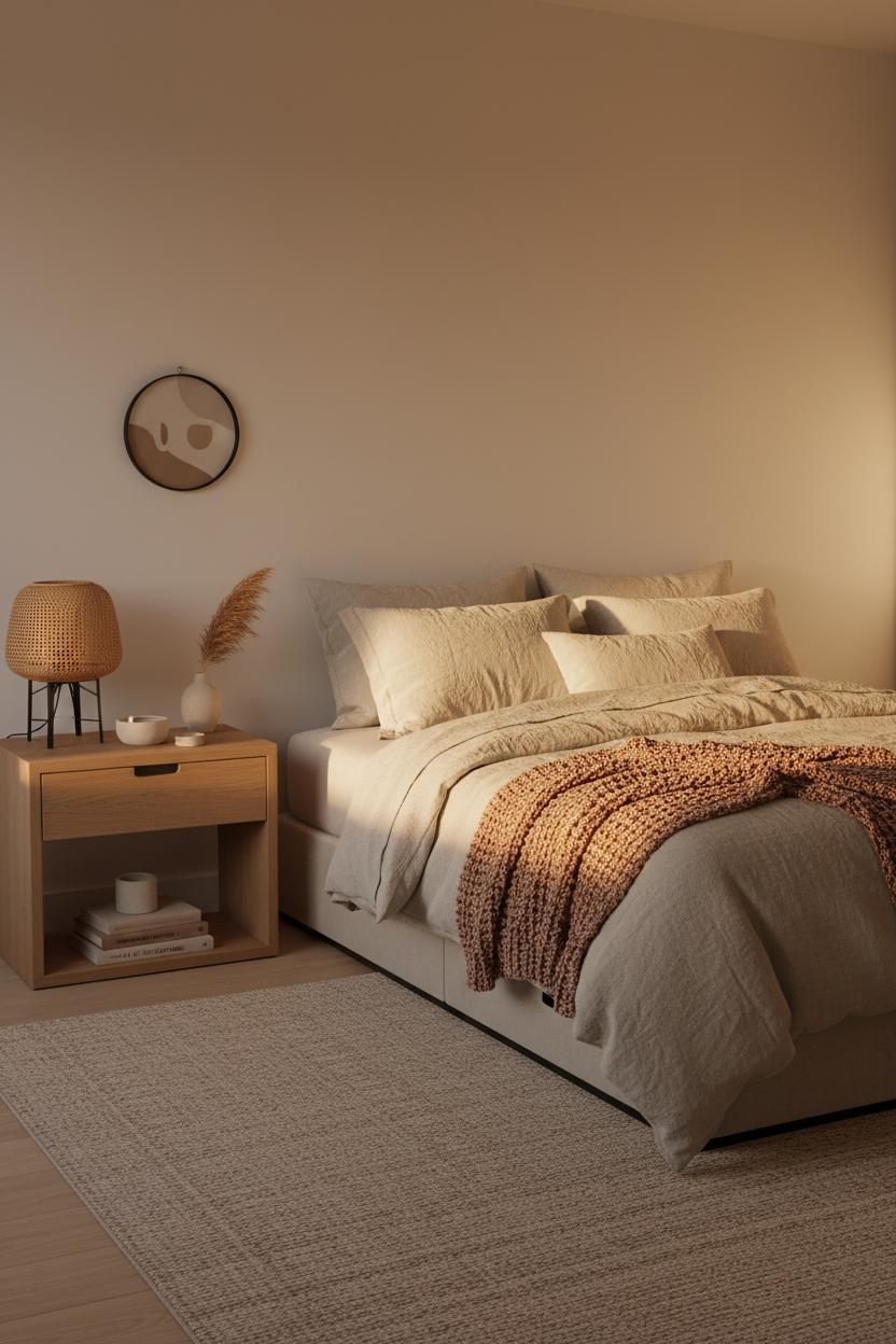 Think of this final layer as the soft hush after sunset—the details that make the whole scene feel lived-in and serene. Start with texture: a breathable linen duvet cover in a sandy tone instantly adds that effortless crinkle and keeps your minimalist bedroom from feeling flat. Ground everything with a neutral area rug that’s warm but not busy; a low-pile or subtly patterned weave feels cozy underfoot without competing for attention. Lighting is everything for those golden-hour vibes, so swap harsh fixtures for a rattan table lamp on a slim oak nightstand, and use a warm bulb or dimmer to get that candlelit glow. A couple of plush pillows in cream and clay, a gauzy throw at the foot of the bed, and a small ceramic vase with dried stems bring in that boho modern touch without clutter. Keep surfaces simple: a single book stack, a stone catchall, and maybe a whisper of scent—amber, vanilla, or palo santo—to layer the mood.