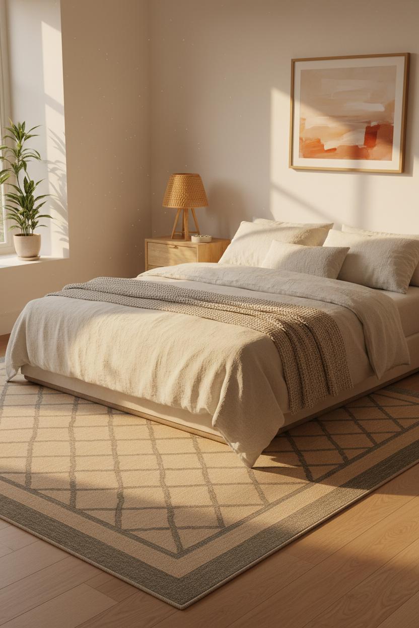 Material-wise, opt for a low-pile wool blend or a sturdy jute-wool mix to keep things streamlined and easy to vacuum, especially if you have pets. Subtle pattern is your friend here: a faint herringbone, a tonal stripe, or a soft Moroccan lattice keeps it boho modern without shouting. Layer with a linen duvet cover in an airy ivory, then let an oak nightstand warm up the corner alongside a rattan table lamp for glow after dusk. On the wall, a piece of framed abstract art in sandy neutrals ties back to the rug’s palette and gives the whole scene that curated-but-cozy edge. If you’re worried about wear, look for a rug with a slightly darker border to ground traffic paths, and don’t skip a cushy rug pad—it adds comfort and keeps edges crisp. The result is a grounded base that makes styling effortless: fold a throw at the foot of the bed, place a ceramic catchall atop the nightstand, and let the textures breathe. With the right neutral area rug, your minimalist bedroom becomes a soft, sun-dipped retreat—proof that the simplest layers can create the most memorable room inspo.