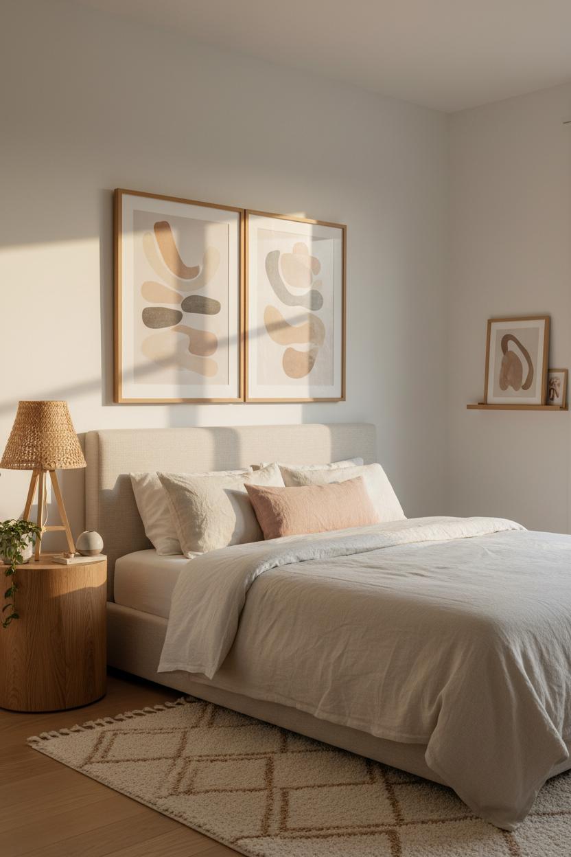 Styling is where the glow happens. Hang the art a touch lower than you think to connect it with the furniture; the line between headboard and frame should feel like one conversation. Let a rattan table lamp wash the surface in honeyed light, and keep the bed dressed in a linen duvet cover so the nubby fabric plays off the art’s soft edges. A neutral area rug underfoot grounds the scene, while an oak nightstand ties in those warm wood frames for an easy, boho modern rhythm. If you’re hunting small apartment ideas, try a single statement canvas that reads like a second window, or lean two medium pieces on a shallow ledge to avoid heavy drilling—layered but edited. Keep the palette tight (cream, sand, mushroom, a trace of blush) and repeat those tones in throw pillows or a ceramic catchall so the framed abstract art feels woven into the whole. The result is a calm, collected room that carries the last light of day long after the sun slips out of sight.