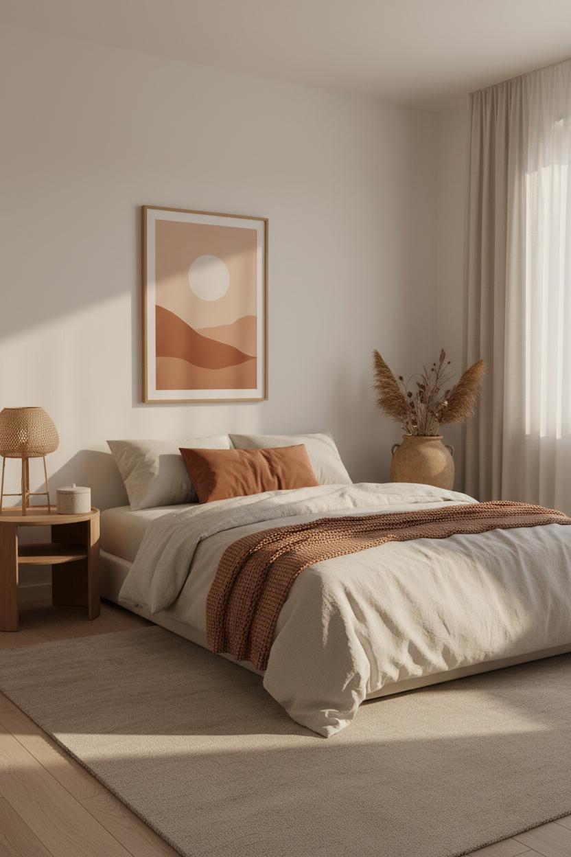 Think of your minimalist bedroom as a quiet sunset in slow motion—soft light pooling across warm, grounded neutrals, everything calm and a little golden around the edges. Start with a tight palette that drifts from creamy white to oat, sand, and muted clay, with a whisper of terracotta or cocoa for depth. The trick is to keep undertones consistent and let the glow do the work: warm whites on the walls, a neutral area rug underfoot to anchor the scene, and layers of matte textures so nothing feels shiny or loud. This is the heart of cozy neutral decor: fewer colors, more feeling. Consider light throughout the day—how morning brightness cools your tones and how evening turns them honeyed. If you’re gathering room inspo, notice the spaces that breathe, where negative space is part of the design and everything has a gentle, relaxed proportion. It’s boho modern at its most serene: easy curves, organic fibers, and a vibe that’s both edited and soulful.