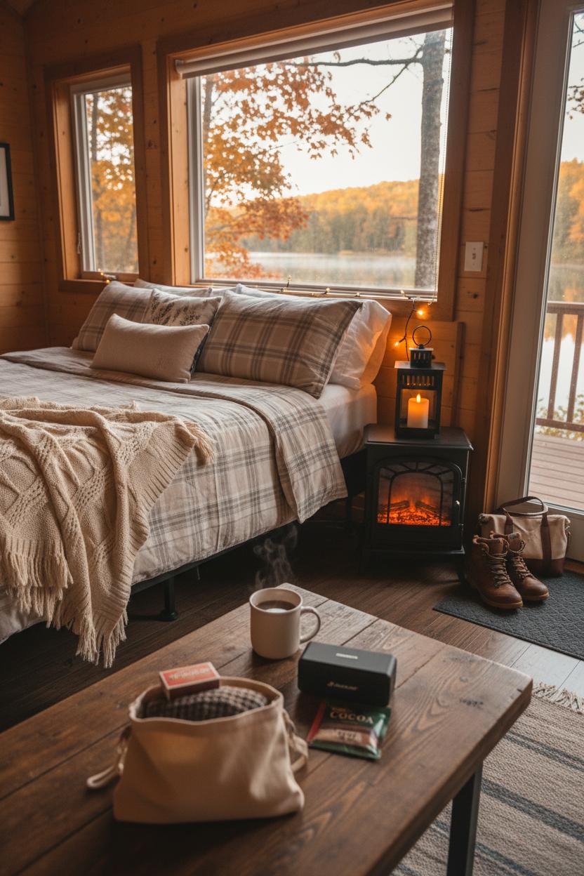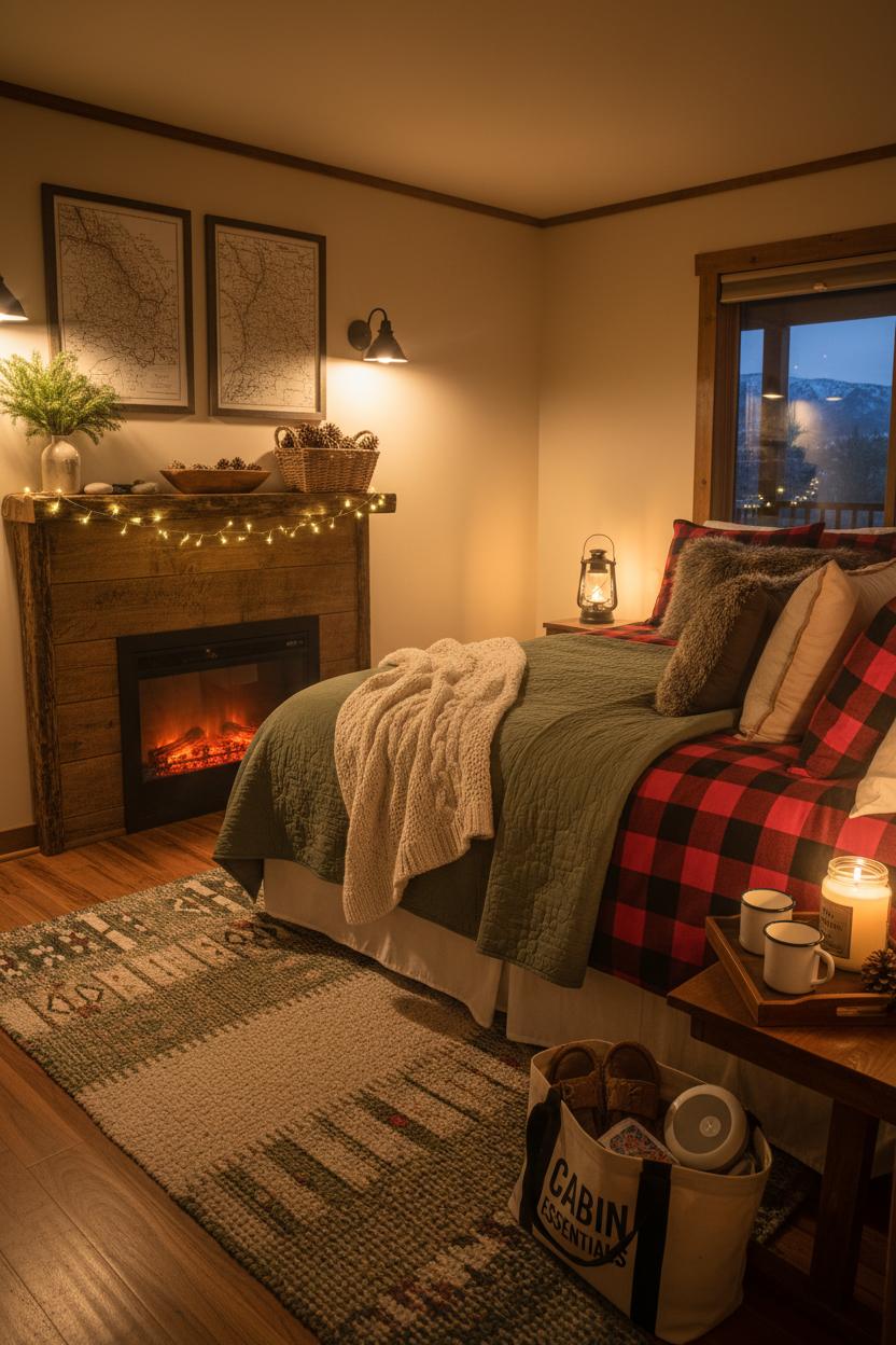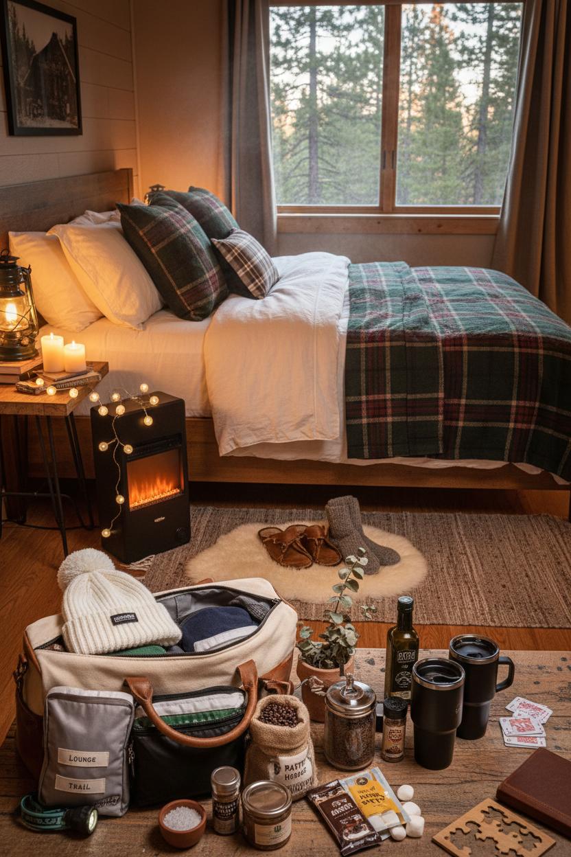 To dial up the hygge, pack a few travel cabin essentials and small comforts that make the space feel like yours. A cabin bedding set you adore instantly levels up the bedscape, while rustic cabin lighting like warm battery lanterns or twinkle strands adds a soft evening glow. Layer in cozy cabin decor—a plaid throw, a candle in your favorite scent, a woven basket for kindling—and, if permitted, a tabletop portable fireplace for marshmallow moments on the deck. Little touches, big cozy energy.