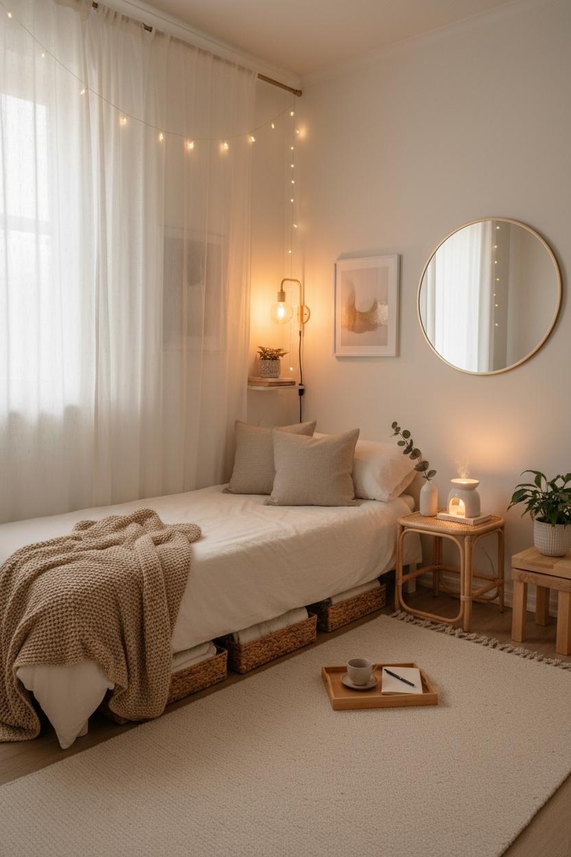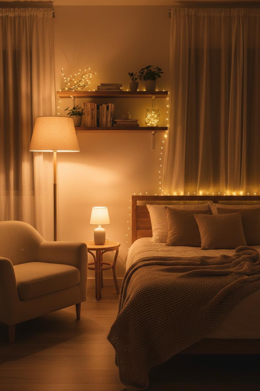 For warm lighting ideas, aim for a trio of glows. Overhead lights can be harsh; instead, drape fairy string lights along a curtain rod or headboard for a twinkly backdrop, add a small table lamp with a warm bulb for reading, and set a ceramic candle warmer on your nightstand for that candlelit vibe—no open flame needed. If floor space is precious, try plug-in sconces or clamp lamps to shelves. Reflective touches, like a framed print with a subtle sheen or a metallic tray, help scatter the light around, giving your small sanctuary a gentle, golden aura that feels calm from morning to midnight.