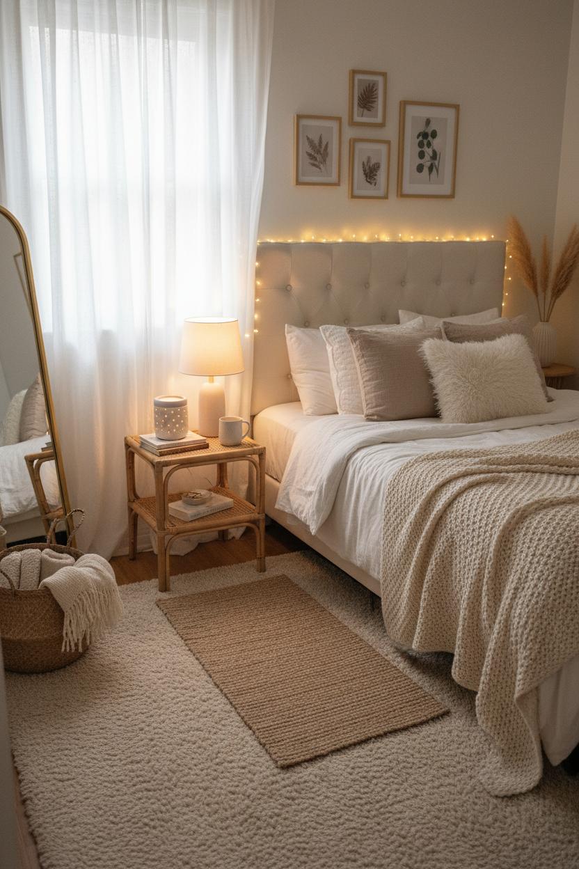 When square footage is limited, think in cozy layers and intentional zones rather than a strict furniture lineup. Start with an anchor piece—a slim daybed or low-profile bed—and let the rest of your bedroom decor orbit around it. Pushing the bed into a corner instantly opens up a walkway, while a rattan side table keeps things airy thanks to its light, woven profile. Keep surfaces minimal but meaningful: a petite lamp, a bud vase, a favorite book. Mirrors and glossy picture frames bounce light, making walls feel farther away than they are, and hanging curtains high and wide elongates the room so it reads taller, not smaller. Choose a soft, neutral palette to calm the eye, then layer on tactile accents to build that cozy room aesthetic without visual clutter.