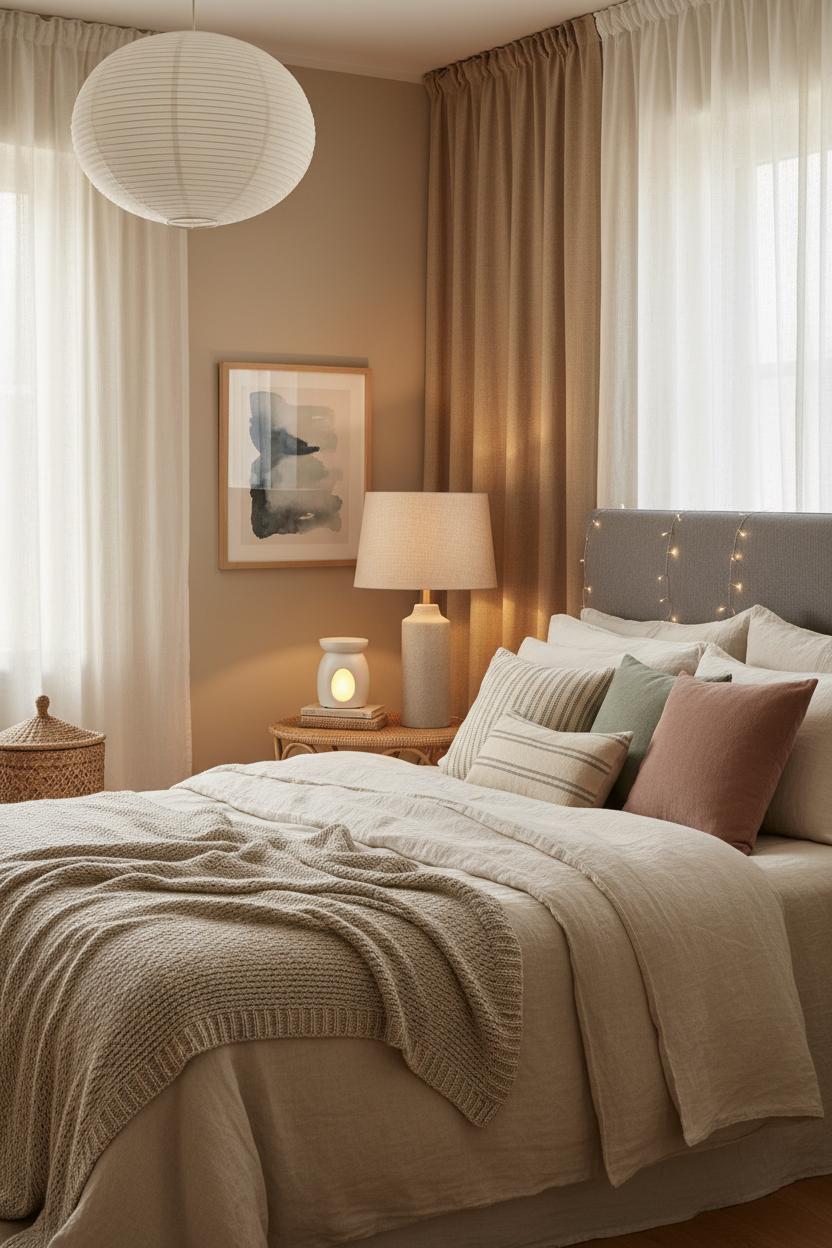 When you’re building a calm foundation for your cozy room aesthetic, start with color. Think soft, sun-warmed neutrals—creamy whites, oat, mushroom gray, and camel—layered with muted accents like sage, dusty rose, or a smoky blue. These tones absorb light gently, so the room feels cocooned rather than stark, which is especially lovely for small room inspiration where every shade affects the mood. Choose one dominant neutral, a secondary tone for depth (maybe a deeper greige headboard or curtains), and a whisper of color on artwork or a throw; this keeps bedroom decor cohesive instead of busy. Pay attention to undertones: warm, buttery whites and sandy beiges play well together, while cool grays can chill the space unless balanced with wood or woven textures. Keep patterns subtle—thin stripes or micro checks—so the eye rests. Then sprinkle in softness with neutral throw pillows that vary in weave, creating interest without visual noise; the palette should look like it could’ve come from a beach pebble or dried herb bouquet.