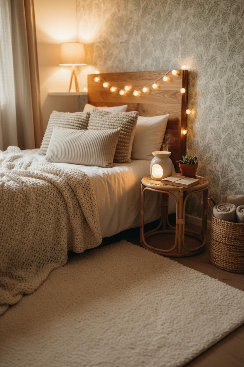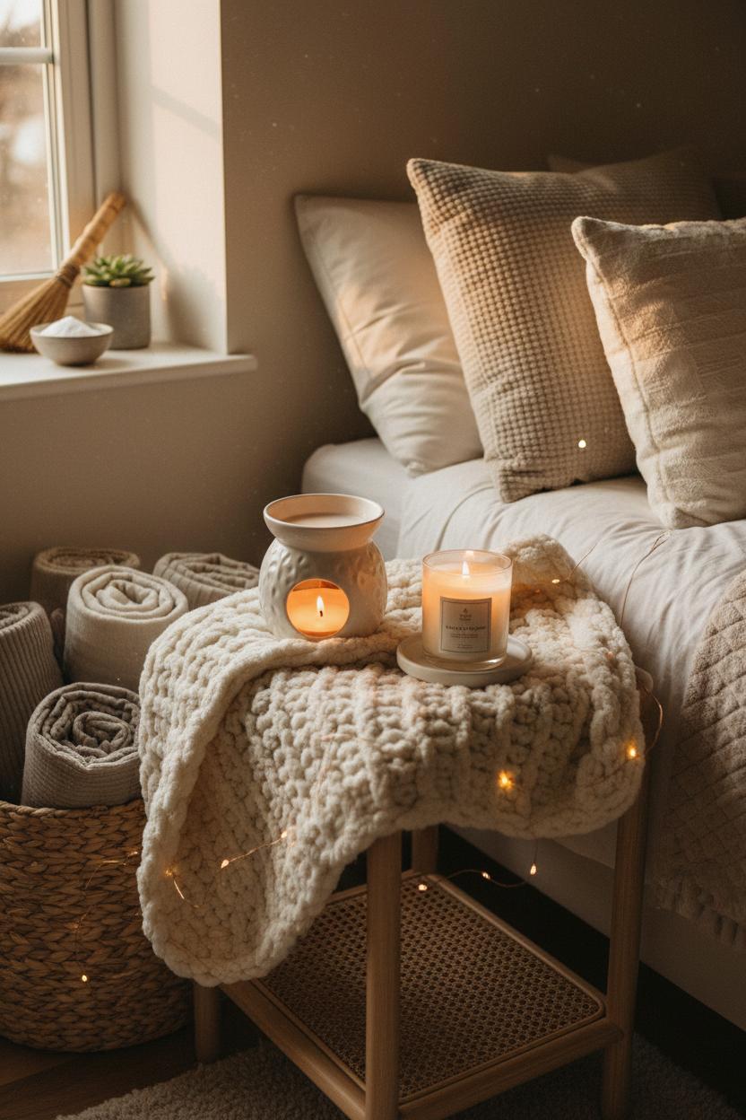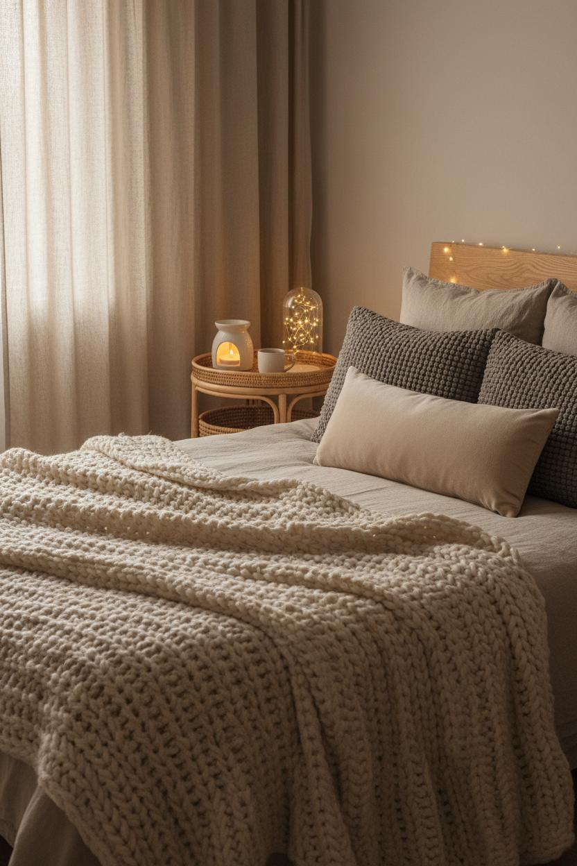 To amplify the softness, pair your textiles with warm lighting ideas that glow instead of glare. Drape fairy string lights along a headboard or tuck them into a glass cloche for a subtle twinkle that skims across the knits and bouclé. A ceramic candle warmer adds that candlelit ambiance with zero fuss, letting your favorite scent mingle with the quiet, golden light. Round it out with an organic accent like a rattan side table—the woven pattern echoes the blanket’s loops and gives your bedside moment a grounded, natural note. If you’re looking for small room inspiration, keep surfaces airy by corralling essentials on a simple tray and let texture do the heavy lifting: repeat each material at least twice (linen pillow + linen curtain, rattan table + woven basket) so the room feels cohesive. The result is a layered bed that invites you to sink in, lighting that flatters every corner, and a whisper-soft palette that calms the eye. It’s the easiest way to turn everyday pieces—chunky knit blanket, neutral throw pillows, and a few warm glows—into a serene, lived-in sanctuary that feels like an exhale.