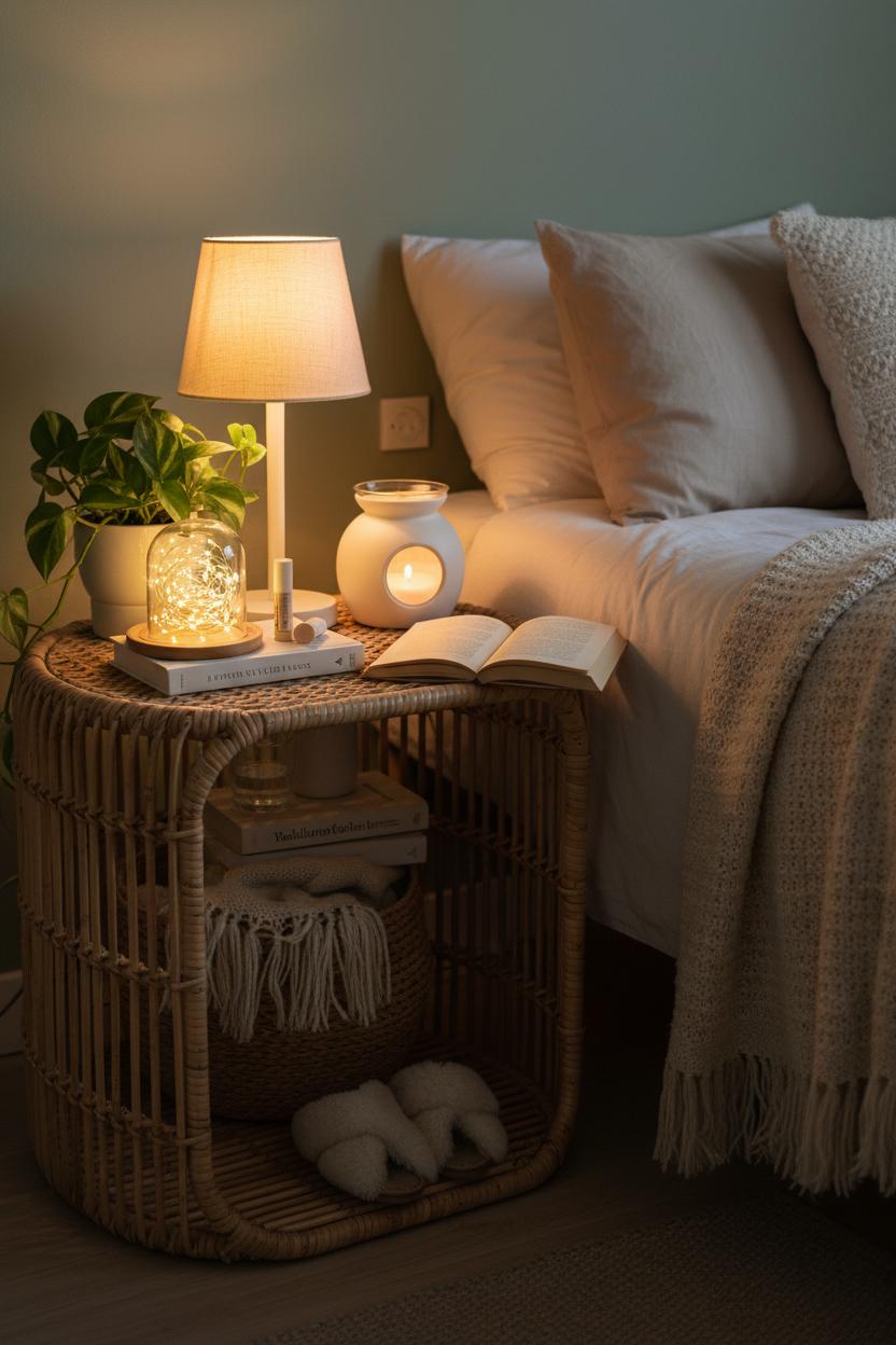 Start with a rattan side table as your nightstand and let texture do half the work for you—the woven pattern instantly feels sun-kissed and airy, and the open silhouette keeps your bedside looking light instead of crowded, which is such a win for a cozy room aesthetic. Then layer in the glow and the greenery. A petite lamp with a linen shade and an amber bulb creates that soft, evening hush; nearby, a ceramic candle warmer adds scent and a candle-like halo without the flame, perfect for winding down. Tuck a strand of fairy string lights into a glass cloche or coil them in a shallow dish to sprinkle a little stardust over your page-turner. Nestle a trailing pothos or a vase of eucalyptus beside the lamp so the leaves catch and soften the light—these warm lighting ideas work together like a chorus, making your bedroom decor feel collected, calm, and quietly luxe.