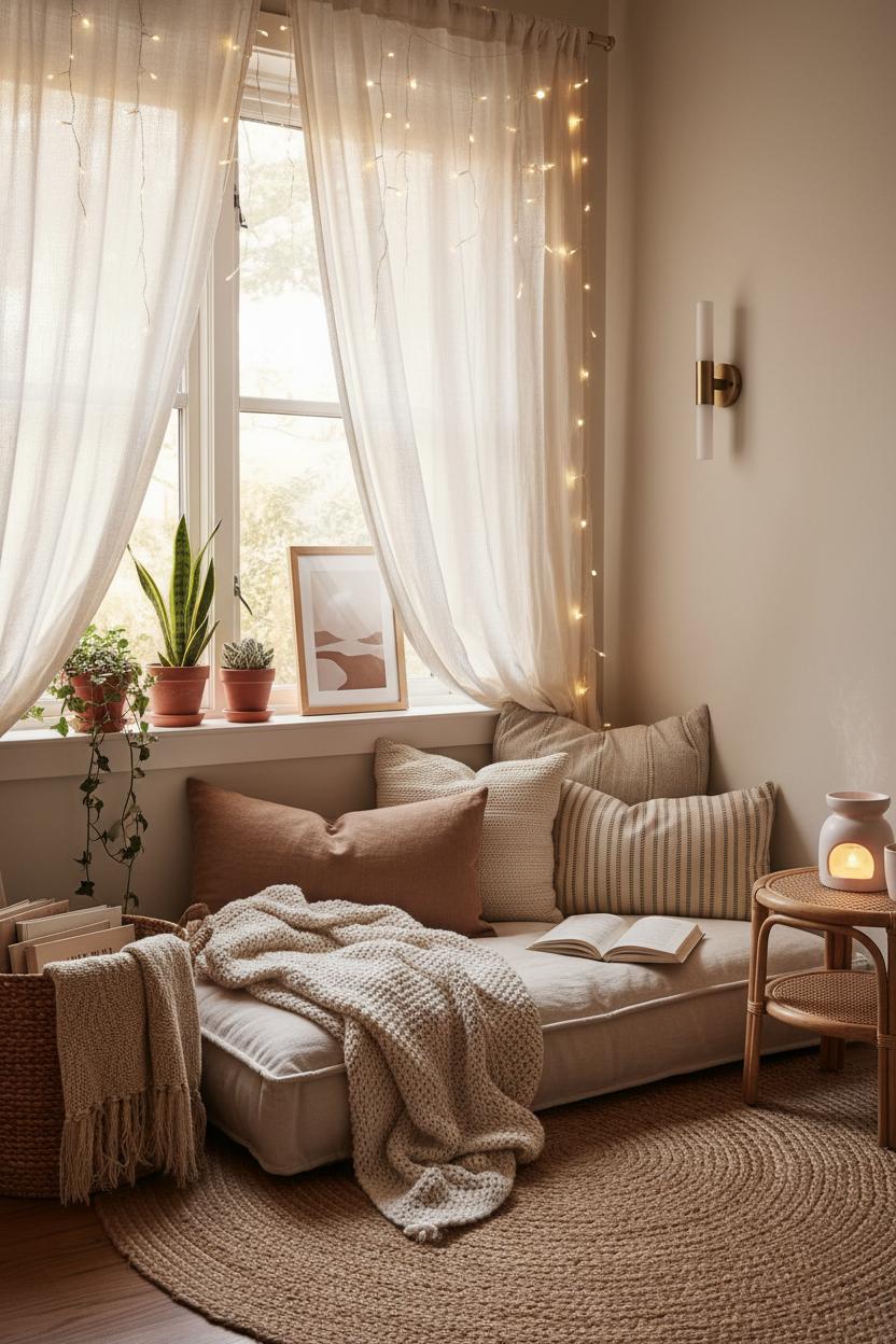 Tiny space? Lean into it. This is peak small room inspiration: mount a slim wall sconce near the nook for layered light, or let the string lights do the heavy lifting with a timer. Use the windowsill as a mini shelf for plants, a mug, or a speaker playing rain sounds; add a framed print or two to tie it into your bedroom decor so the nook feels intentional, not improvised. The goal is a pocket of calm where your shoulders drop the moment you sit—soft seating, gentle glow, and textures you can’t help but touch.