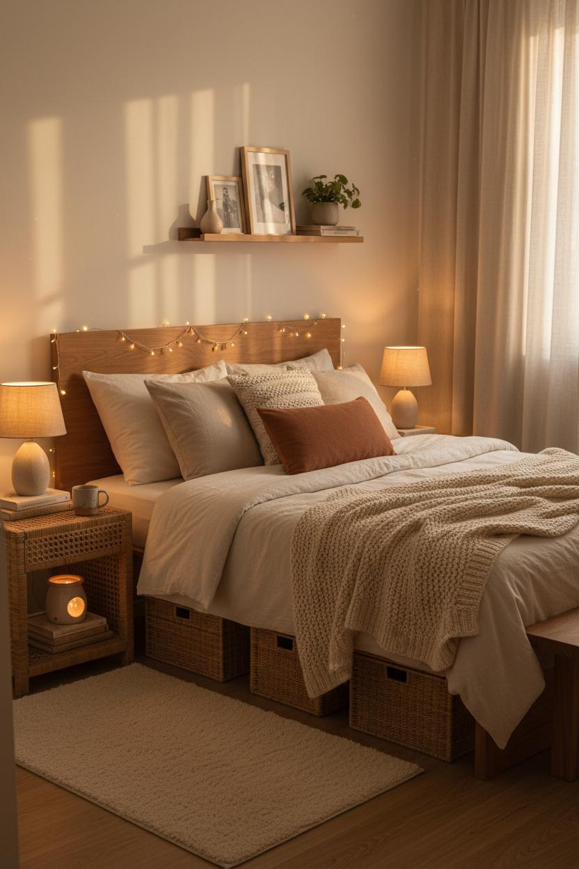 Finally, edit with nature and meaningful details. Bring in warmth with woven baskets for throw storage and a ceramic catchall for jewelry or lip balm. Add dried stems or a low-maintenance plant to break up all the softness with organic shape. A gallery of small prints, a leaning mirror to bounce light, and airy curtains that pool just slightly all contribute to that layered, collected look. Keep surfaces curated—your rattan side table, a favorite book, a candle, maybe a little trinket from your travels—so your bedroom decor feels intentional, not busy. With these simple, shoppable pieces—fairy string lights, a ceramic candle warmer, a chunky knit blanket, neutral throw pillows, and a chic rattan side table—you’ll have everything you need to nail the cozy room aesthetic, whether you’re revamping a master suite or seeking smart, small room inspiration.