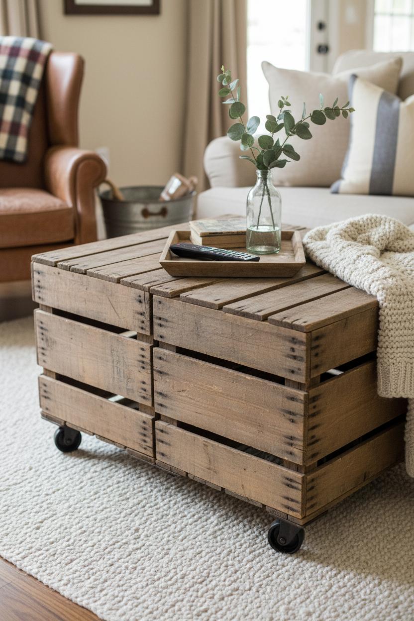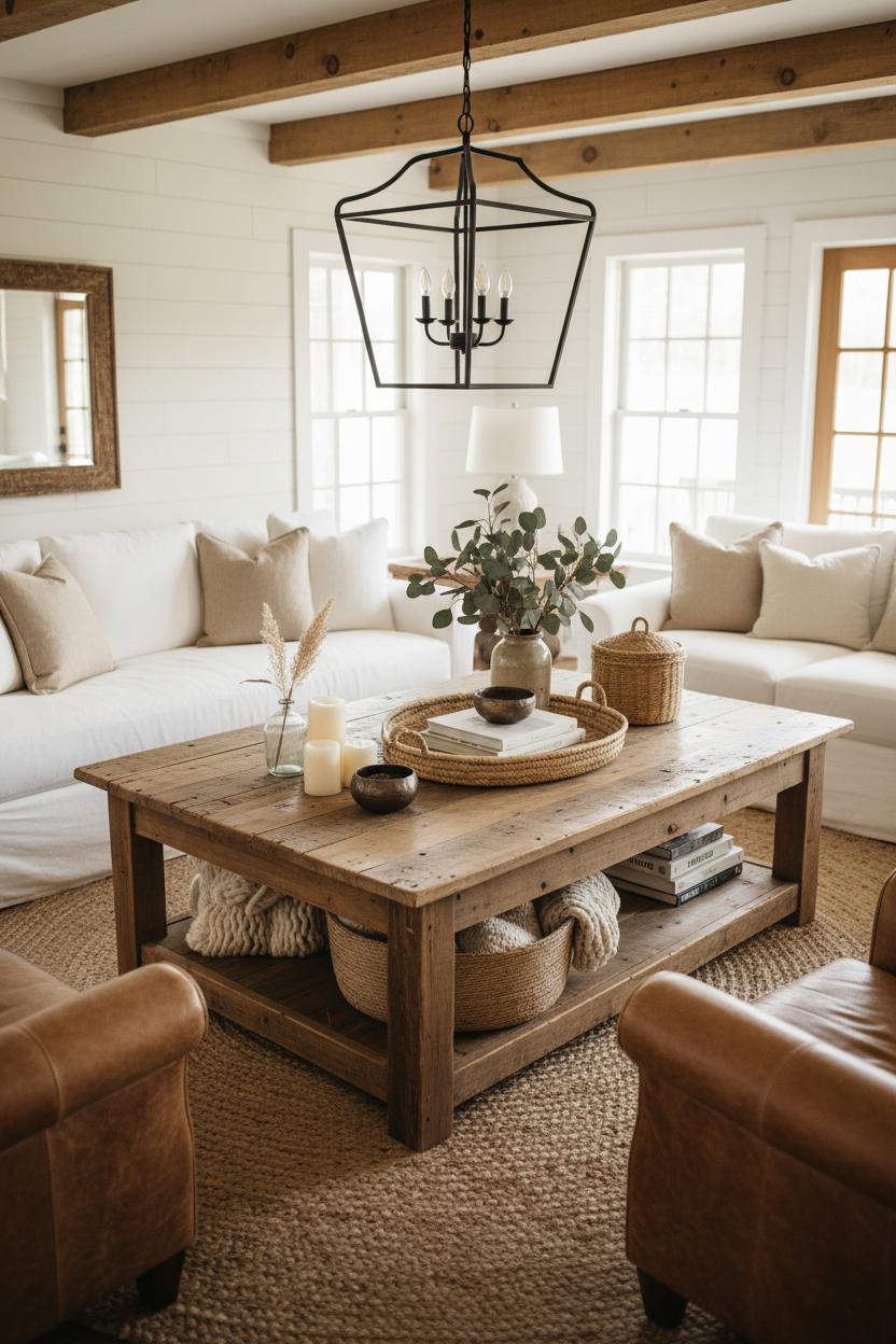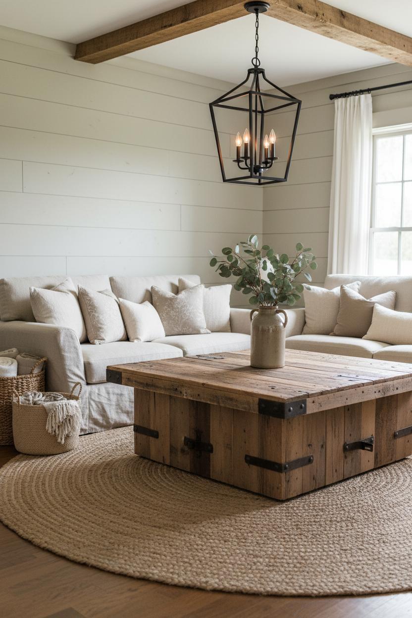 Styling this centerpiece is all about balance and warmth. Keep the surface low and lived-in by mixing heights: a chunky candle or two, a petite vase, maybe a lidded basket for remotes. If you’ve got a lantern chandelier overhead, the glow will dance along the wood and make the whole room feel like golden hour. Tuck a seagrass bin beneath the table for throws, and stack a few board games at the ready—instant weekend plans. If you’re playing with shiplap wall ideas but not ready for the nail gun, try shiplap wallpaper behind the sofa to echo the table’s reclaimed character without the commitment. The combo reads curated and cozy, not theme-y, and works just as well in a refined rustic living room as it does in a laid-back family hangout. Rotate the tabletop accents with the seasons—citrus and linen in spring, pinecones and chunky knits in winter—and you’ll have a constant stream of cozy living room ideas without starting from scratch. In the end, that reclaimed wood coffee table doesn’t just fill a floor plan; it grounds the room, invites people in, and becomes the everyday centerpiece of your farmhouse decor story.