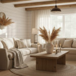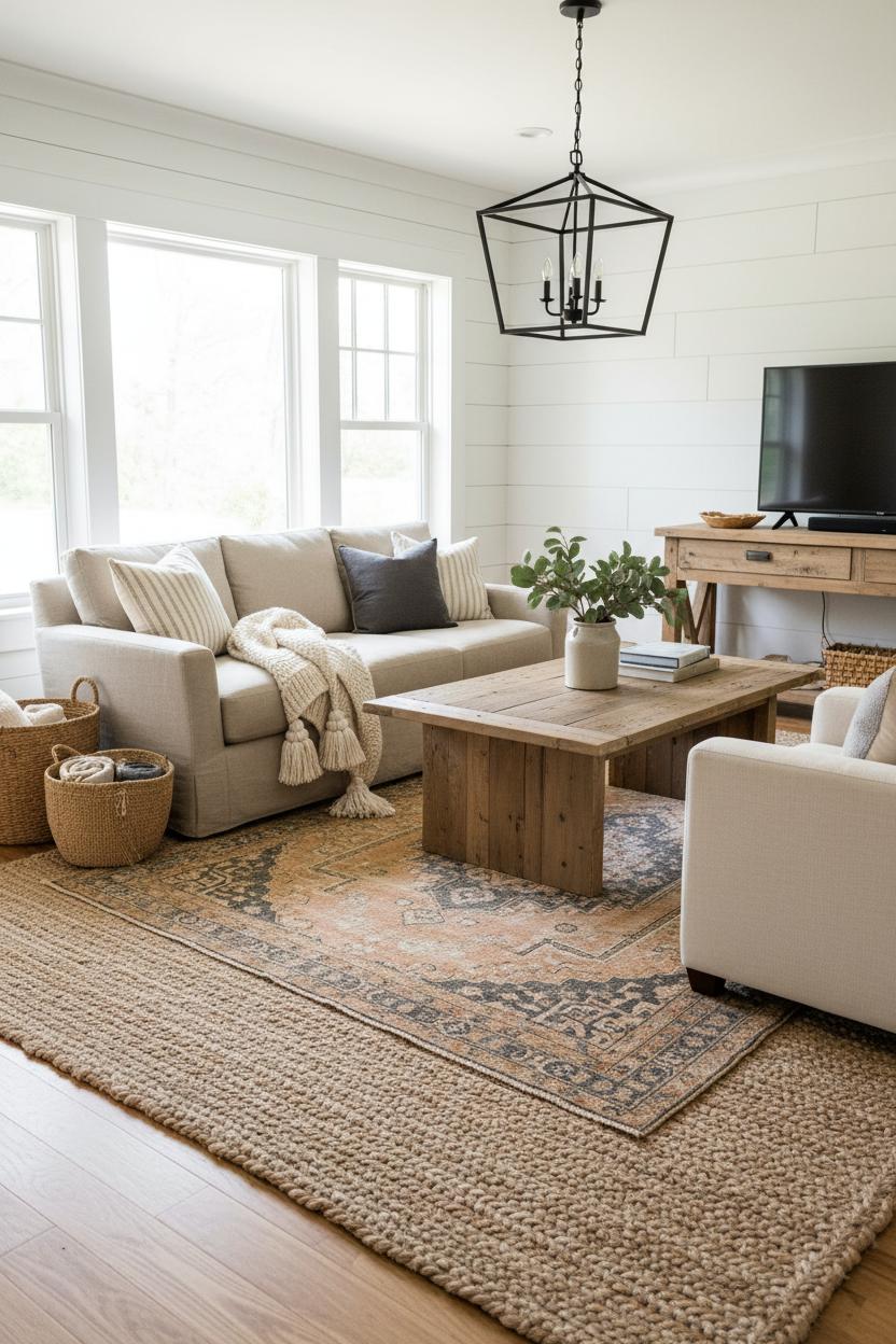Style the scene with a reclaimed wood coffee table centered on the rug to echo the warm, organic vibe, and let a lantern chandelier glow overhead for soft farmhouse sparkle. If you’re playing with shiplap wall ideas, the subtle stripes of the boards pair beautifully with the understated weave below; renters can even try shiplap wallpaper for instant texture without the commitment. Keep the palette light and layered—oatmeal, caramel, creamy whites, and a hint of charcoal—then tuck a few faux eucalyptus stems into a glass demijohn or stoneware crock for a fresh, muted green moment that reads timeless, not fussy. This is one of my favorite cozy living room ideas because it works in every season: in summer, the jute feels breezy; in winter, it’s the perfect foil for chunky knits and candlelight.