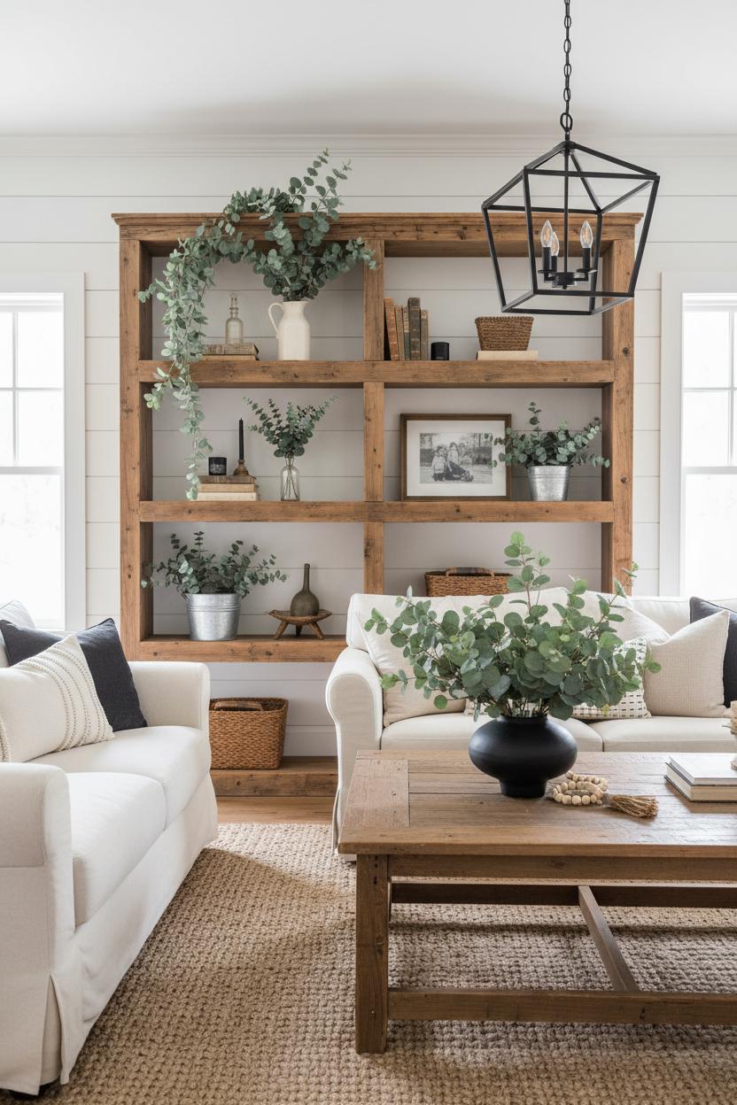 To tie the shelves into the rest of your rustic living room, echo the greenery on a reclaimed wood coffee table with a low, wide vase of faux eucalyptus stems and a beaded garland. Ground the vignette with a chunky jute area rug, and let a lantern chandelier cast a warm glow over the scene in the evenings. The result is layered, welcoming, and seasonless—just swap in pinecones for winter or dried florals for fall while keeping your eucalyptus as the year-round base. A little greenery goes a long way, and with these simple touches, your shelves will feel like a breath of fresh air every time you walk in.