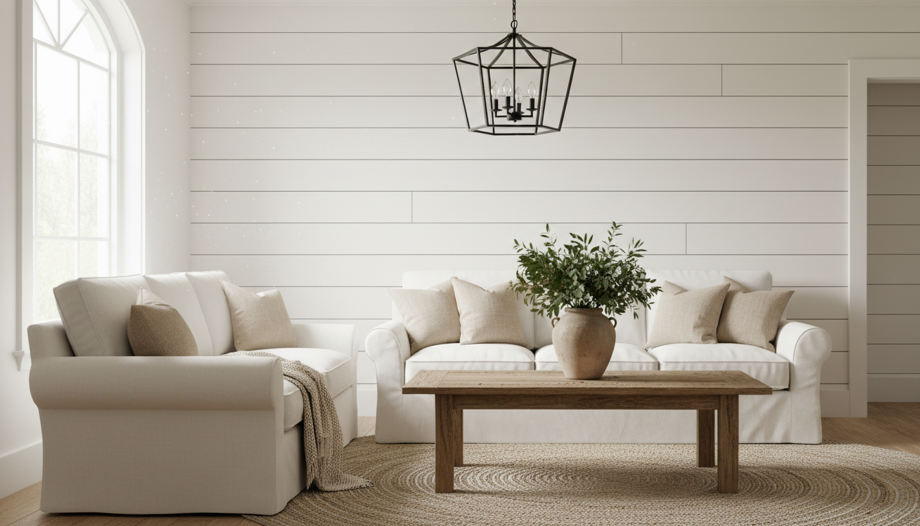 Styling is where the magic happens. Pair your shiplap—real or faux—with a reclaimed wood coffee table to ground the space and add that gathered-over-time warmth. A chunky jute area rug softens all the straight lines, while a lantern chandelier pulls the eye upward and makes the room glow at night. Keep the palette soft: classic white boards feel bright and coastal-farmhouse; warm greige brings instant coziness; even a moody charcoal accent wall can lean modern while still reading as farmhouse decor. Sprinkle in texture with woven baskets, a stack of linen pillows, and a ceramic jug filled with faux eucalyptus stems for a fresh, effortless finish. If you love to mix, try real boards on one feature wall and shiplap wallpaper in an adjoining hallway to carry the story without the full install. However you land, shiplap is the easiest way to frame your favorite pieces and create a homey backdrop that whispers “come in and stay awhile.”
