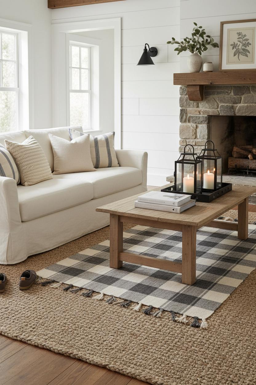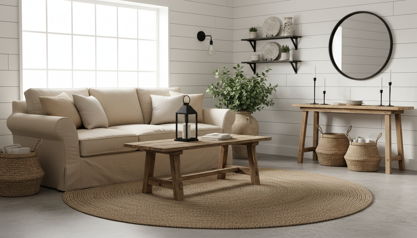 Nothing cozies up a space faster than texture underfoot, and a jute area rug is the secret ingredient that instantly grounds a rustic farmhouse living room. Its sandy, sun‑washed fibers bring that organic, coastal‑meets‑country vibe, softening hard floors and adding visual warmth without stealing the show. Roll one out beneath a linen slipcover sofa and you’ll notice how the nubby weave plays so nicely with relaxed, lived‑in upholstery. It’s the perfect base for layering a reclaimed wood coffee table, a stack of favorite design books, and a tray of black metal lanterns flickering at dusk. Jute reads neutral but never flat; the weave catches light and shadow, creating dimension that photographs beautifully and makes a cozy living room feel instantly more collected. If your space has shiplap walls, the natural fibers echo that timeless texture—especially if you’re exploring shiplap ideas like a crisp white backdrop with matte black accents—keeping everything firmly in that modern farmhouse style sweet spot.