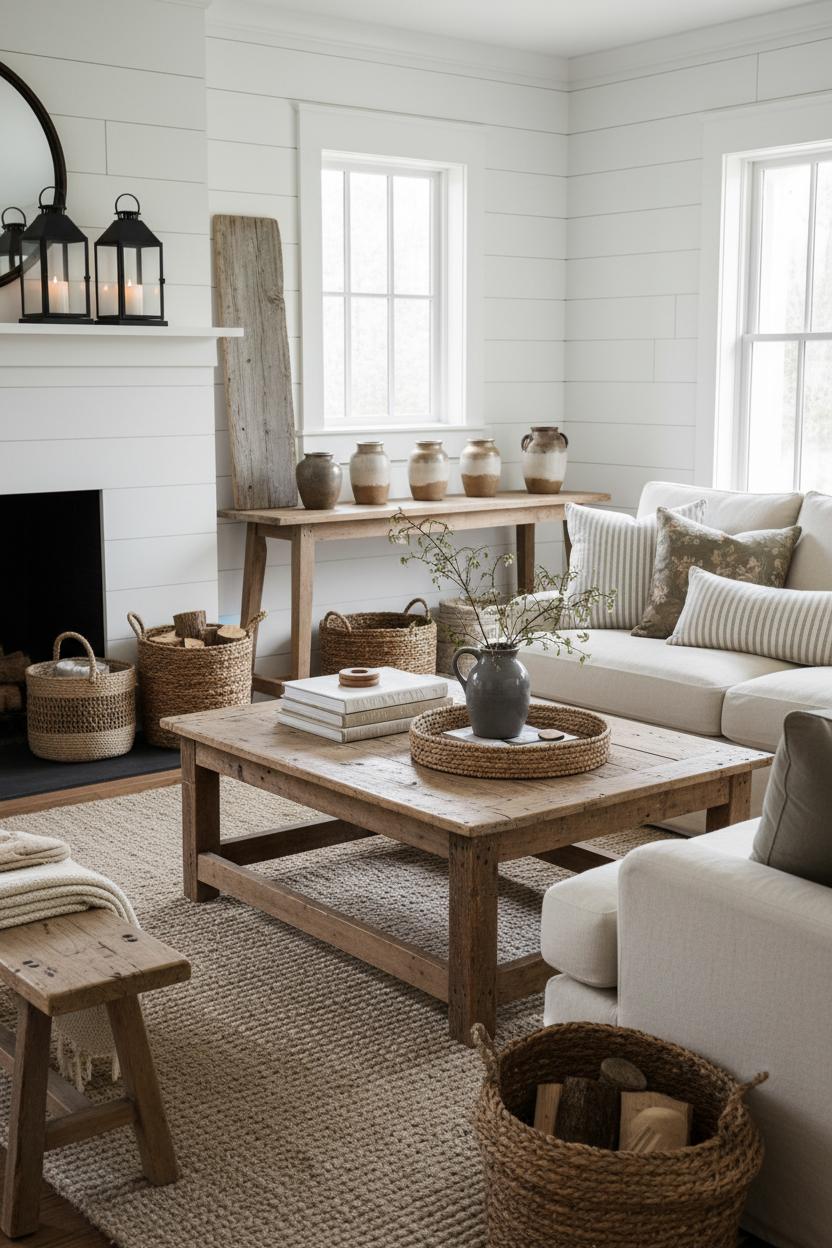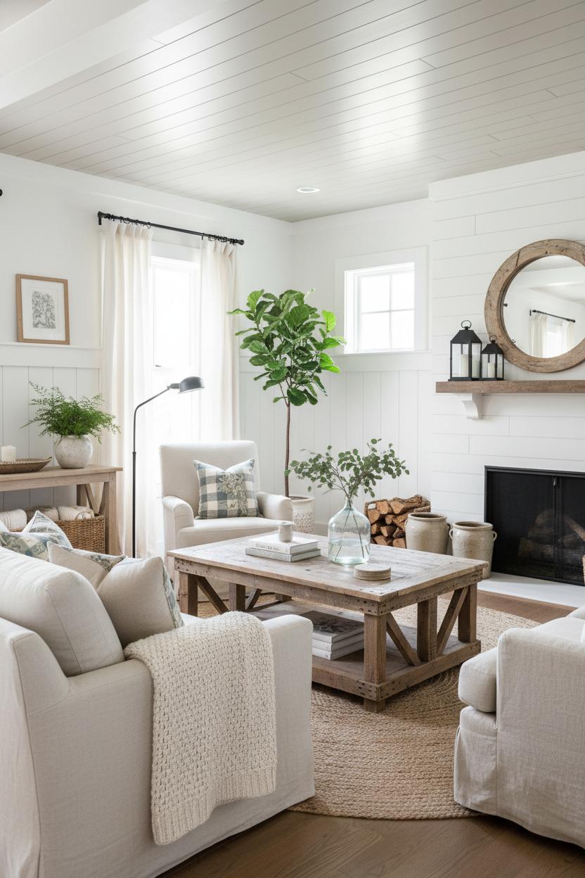 Architectural details do a lot of the heavy lifting in a rustic farmhouse living room, so consider shiplap ideas that add quiet character without stealing the show—think a fireplace surround in crisp white, a half-height wainscot behind the sofa, or even a shiplap ceiling washed in pale greige to draw the eye up. Balance all that soft, weathered wood with a few sleek accents for contrast: black metal lanterns on the mantel, simple iron curtain rods, or a matte-black floor lamp to sharpen the silhouette of those squishy sofas and chairs. Keep furnishings streamlined and purposeful—nesting tables, a slim console, woven baskets for throws—so the space feels open and airy, not cluttered, even when real life happens.