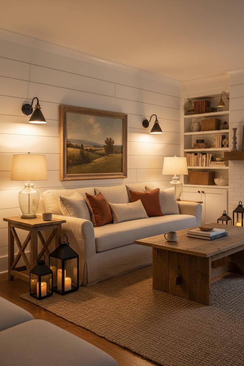 When it comes to a glow that feels like golden hour all evening long, layering your light is the secret sauce. Start with sconces to wash your walls in a soft, flattering halo. If you’re playing with shiplap ideas, mount a pair on either side of a favorite landscape print or a vintage mirror to add gentle dimension to that texture. In a modern farmhouse style room, choose finishes that nod to timeworn hardware—matte black, aged brass, or antique pewter—and put them on dimmers so the mood can slide from lively to lullaby with one touch. Sconces are also wonderful along a reading nook or above built-ins, where their glow skims books and baskets and makes every vignette feel intentional. Even in a small rustic farmhouse living room, those slender wall lights free up tabletops while adding a welcoming, candle-like shimmer to your farmhouse decor.