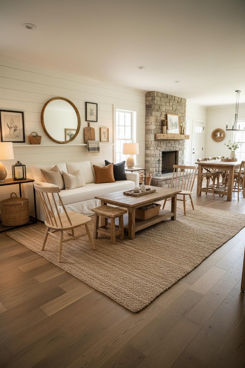 Vertical definition is your secret weapon in a modern farmhouse style space. Consider subtle shiplap ideas—like a half-height treatment behind the sofa or a full accent wall in a creamy white—to frame the living zone without closing it off. Add a slim ledge shelf or peg rail for layered farmhouse decor that’s pretty and practical (think woven baskets for remotes, a striped throw, a vintage cutting board for texture). Lighting finishes the plan: mix warm table lamps with black metal lanterns on the console or hearth for that soft evening glow, and add a dimmer so the mood shifts from lively to tucked-in at night. Keep surfaces hardworking and family-friendly: a reclaimed wood coffee table hides life’s scuffs, nested stools slide out for extra perches, and a lidded basket under the console corrals kids’ books. Carry the same wood tones and metals across the dining island and entry to visually link the zones, then echo textures—linen, jute, weathered oak—so your open layout reads as one calm, collected story. The result is a rustic farmhouse living room that feels grounded, welcoming, and beautifully connected to the rest of your home.