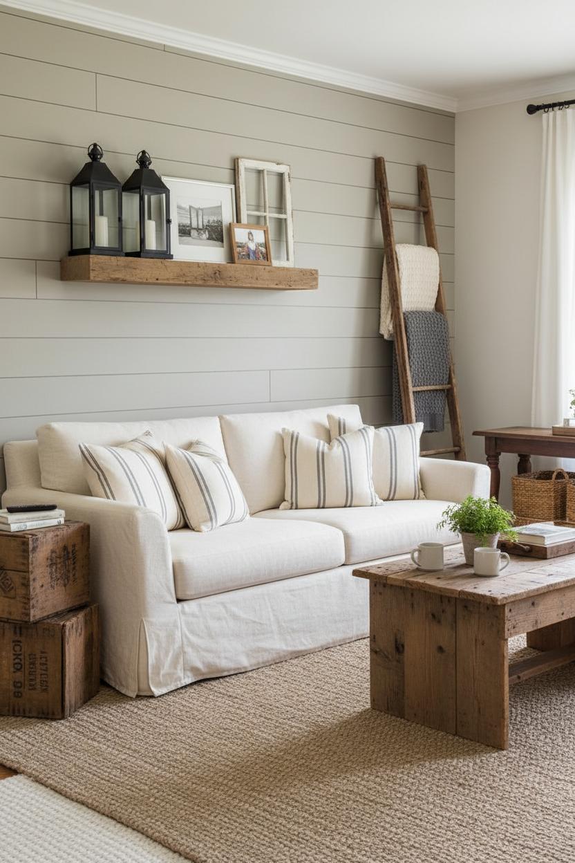 Lean into upcycling to layer soul and character without breaking the budget. A reclaimed wood coffee table grounds the seating area with organic warmth, while old crates stacked as side tables hold books and remotes with rustic charm. Turn a vintage ladder into a blanket rack next to the sofa, slip thrifted frames with chippy paint into a casual gallery, and tuck a few woven baskets under a console for hidden storage. Swap in fresh throw pillow covers each season—grain stripes in summer, cozy knits in winter—for an easy style refresh that feels intentional and collected. Mason jars become candleholders, wire baskets corral throws, and salvaged windows make dreamy wall art over your shiplap backdrop. Keep your palette natural and layered—creamy whites, weathered woods, brushed metals—so every piece feels connected. With a few smart DIYs and thoughtful secondhand finds, your rustic farmhouse living room will feel curated and comfortable, like it evolved over time. It’s the perfect blend of polished and imperfect, where your shiplap ideas set the stage and those upcycled accents tell the story.