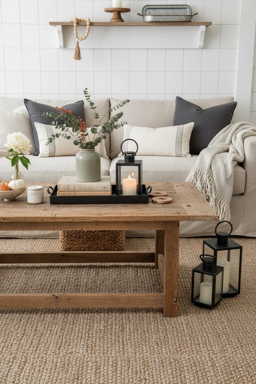 At the heart of every rustic farmhouse living room, the coffee table does more than hold mugs—it sets the mood. Let your reclaimed wood coffee table steal the show with its knots, grain, and timeworn character, then layer on soft, practical touches that invite lingering. Start by grounding the scene with a nubby jute area rug, whose natural texture balances the table’s sturdy presence, and pair it with a relaxed linen slipcover sofa in creamy neutrals. A low, generous tray keeps things tidy: stack two or three vintage-look books, nestle a stoneware vase with eucalyptus or dried stems, and add a candle or two for evening glow. For a little edge, weave in black metal lanterns—either petite ones up top or a taller pair on the floor—so the flicker plays against the wood’s patina. Mix materials to feel collected-not-cluttered: warm wood, soft linen, matte black, and clear glass. Don’t forget the hands-on comforts—pretty coasters, a match striker, and a lidded basket for remotes—so your cozy living room looks styled but lives easily.