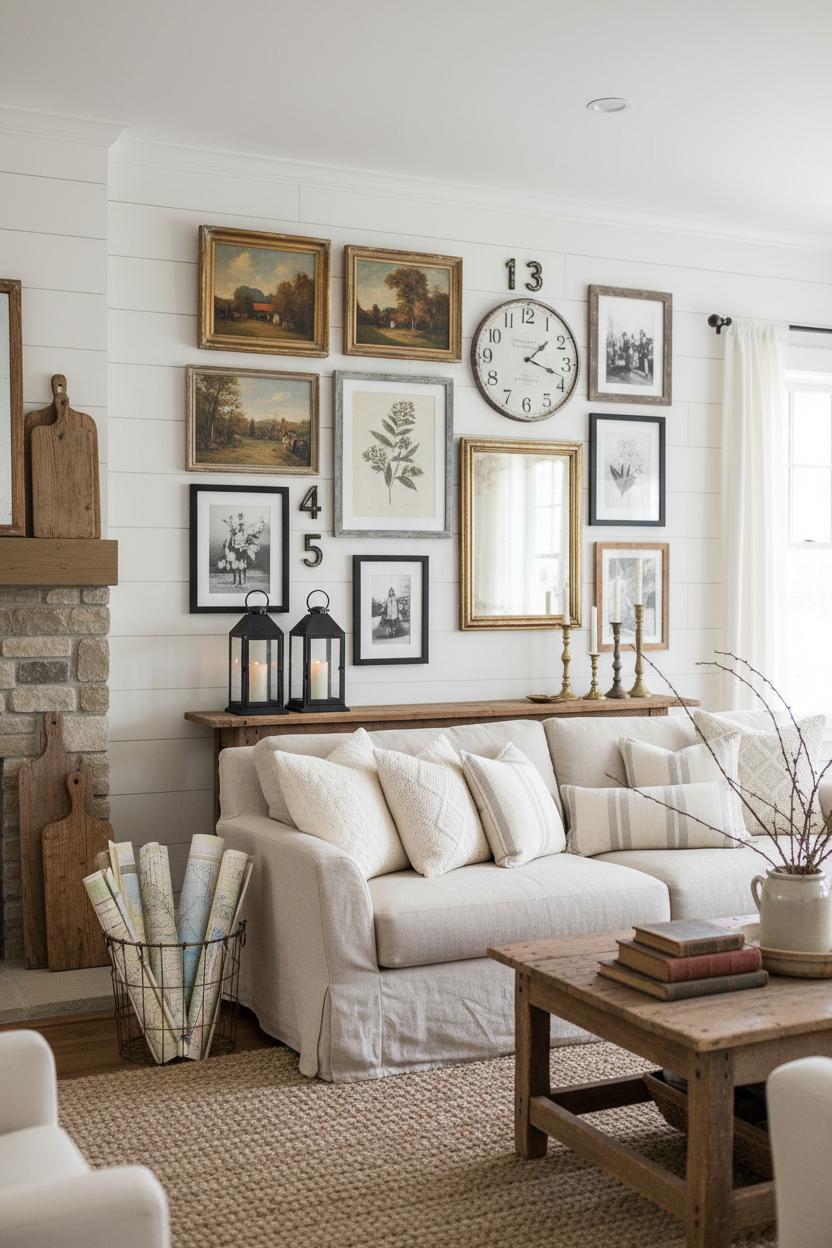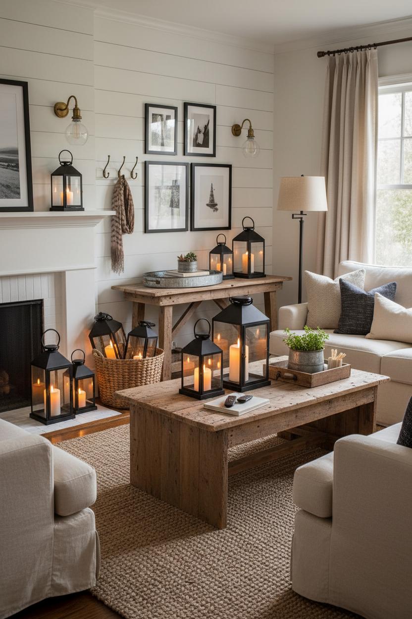 Nothing sets the tone for a rustic farmhouse living room quite like a well-collected gallery wall. Think layers of personality: a mix of vintage oil paintings, family photographs in chippy frames, pressed botanicals, and an oversized farmhouse clock, all grounded by a cohesive palette of black, white, and warm wood. Start by choosing a backdrop—if you have shiplap, it’s the perfect canvas, and if not, consider simple shiplap ideas like a single accent wall or a whitewashed panel to add that softly textured, timeworn vibe. Arrange pieces in a loose salon style, balancing sizes and shapes, and let patina be your guide. A few sleek black frames woven among old wood ones keeps the look fresh and leans into modern farmhouse style without losing the soul of farmhouse decor. Place a pair of black metal lanterns on a picture ledge or console beneath the gallery to draw the eye up and create a glow that instantly feels like a cozy living room moment.