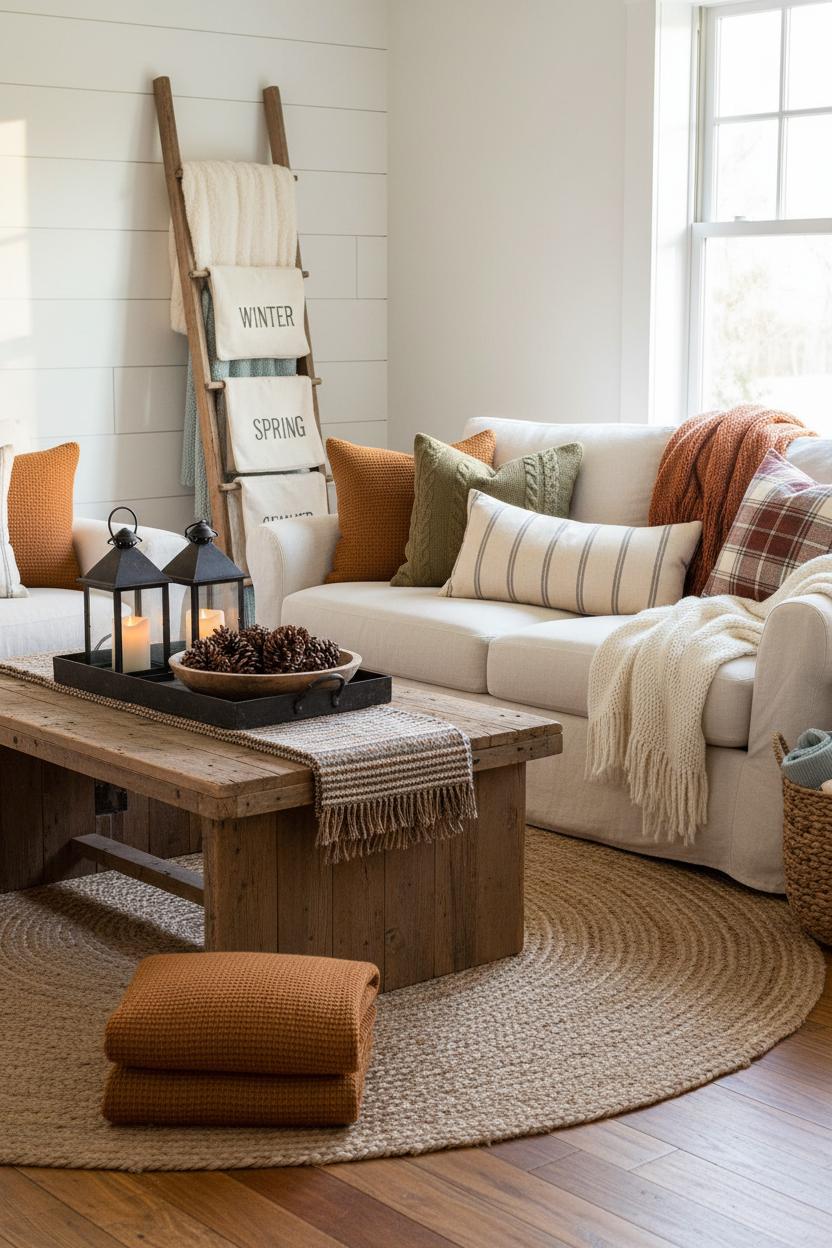 To make the seasonal swap seamless, keep your base light and layered: a pale sofa, warm wood tones, and a neutral backdrop—perfect if you’ve been eyeing shiplap ideas for an accent wall. That soft, whitewashed texture lets the fabrics do the talking and plays beautifully with both farmhouse decor and modern farmhouse style. Don’t be afraid to blend high and low: linen, cotton, faux shearling, and boucle all mingle beautifully. Use pillow inserts one size larger than your throw pillow covers for that plump, designer look, and stash off-season covers in labeled pouches in a basket beside the sofa or on a blanket ladder for pretty, functional storage. A few seasonal flourishes—like a bowl of pinecones in winter or fresh eucalyptus in spring—tuck right onto the coffee table without crowding the textiles. With these simple swaps, your living room evolves gracefully all year long, staying welcoming and lived-in—the kind of space where you kick off your boots, curl up under a soft throw, and let the day slow down.