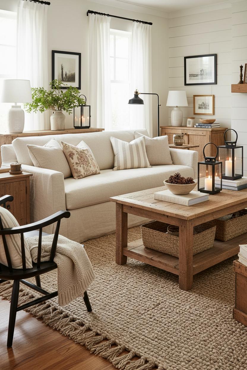 Creating a cozy rustic farmhouse living room starts with a soft, collected foundation that feels like it’s evolved over time. Think creamy whites, oatmeal linens, and weathered woods that invite you to sink in and stay awhile. An easygoing linen slipcover sofa becomes the anchor—washable, relaxed, and perfect for Sunday lounging—while a chunky jute area rug grounds the seating and brings in that nubby, barefoot texture every cozy living room craves. Layer in a reclaimed wood coffee table with knots and character, then scatter woven baskets, leafy branches in a stoneware jug, and a few black metal lanterns to add warm flicker and contrast. Swap in seasonal throw pillow covers in stripes, ticking, or subtle florals for a quick refresh, and mix metals sparingly—aged brass with matte black—to keep your farmhouse decor feeling curated, not themed. Keep lighting varied with a shaded floor lamp, a table lamp on a vintage crate, and the lanterns for evening glow; it’s all about those soft pools of light.